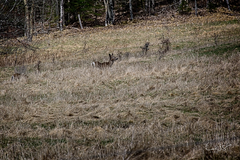 On my way home I found a few young deer grazing in a field along side of the road. There are springs of green grass peeking through the matted leftovers from the seemingly long and very soggy winter.
