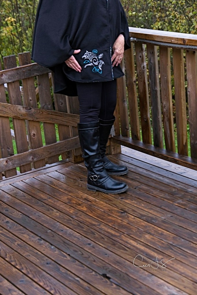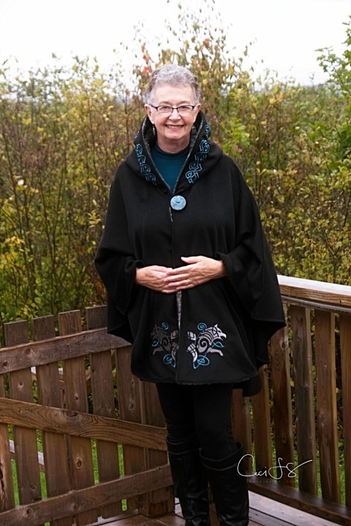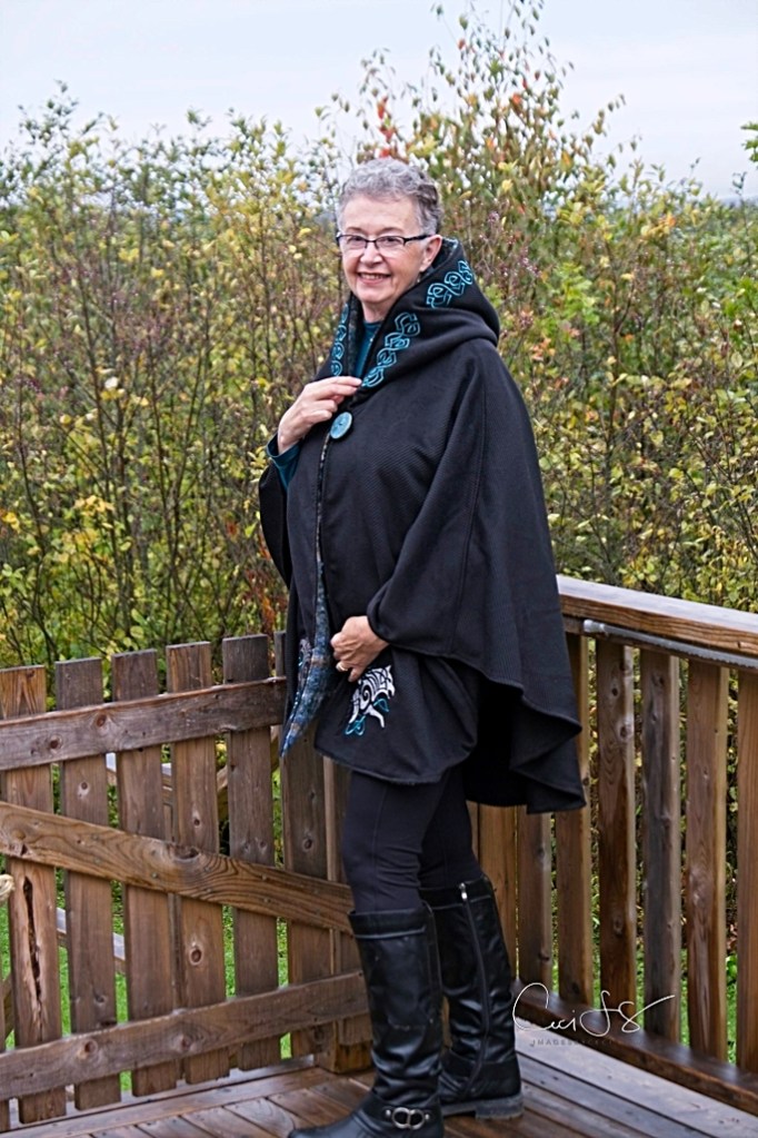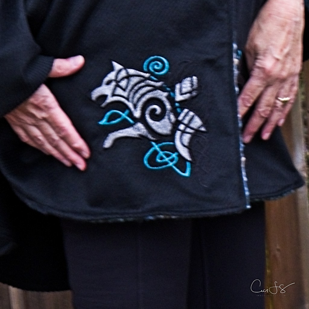 Since I happen to have a fetish for wolves, I asked if it would be possible to have a Celtic Wolf as an appliqué on a cape that I lusted after. Heather assured me that anything is possible and sure enough – she delivered on that promise!