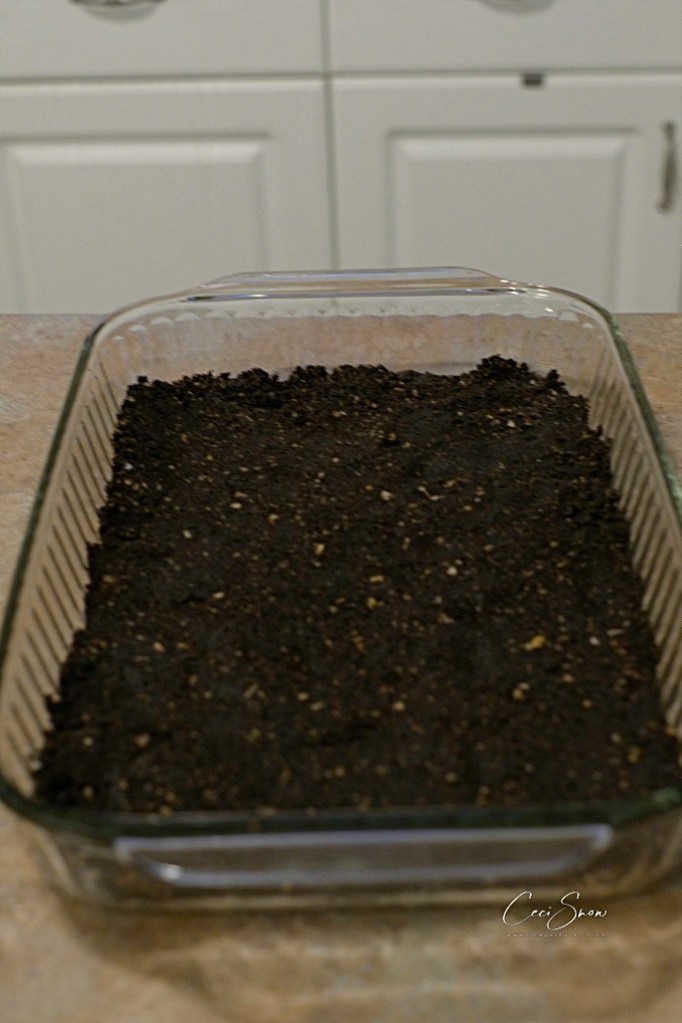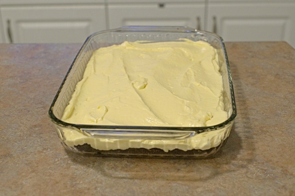 Preheat oven to 350ºF (I can’t cook in metric). Mix crumbs, butter, nuts and coconut and press firmly onto the bottom of a 9″ x 13″ pan. Refrigerate will you prepare the filling.