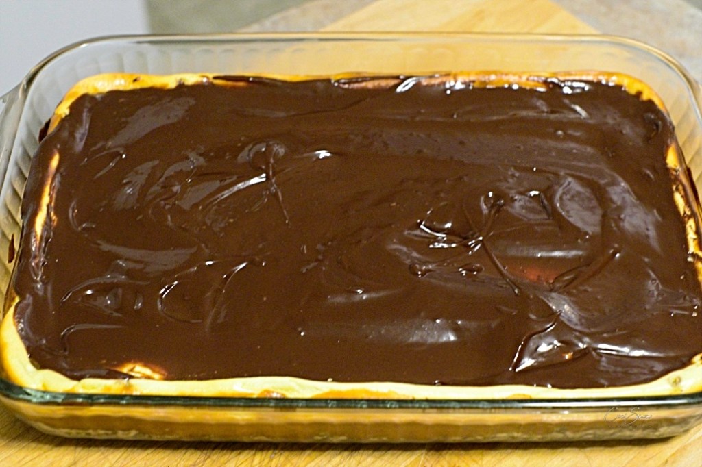Pour over the squares and refrigerate until the chocolate firms up.