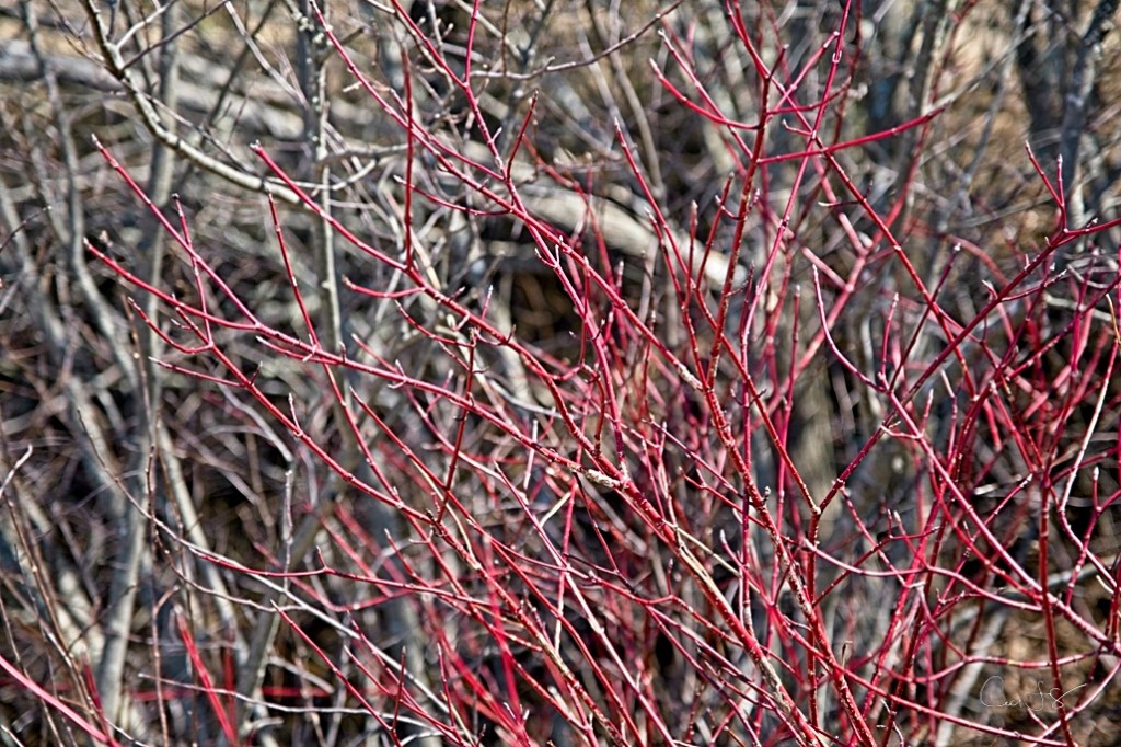 I love the tangles of bright red branches at this time of year – a portend of colour to come soon from Mother Nature.