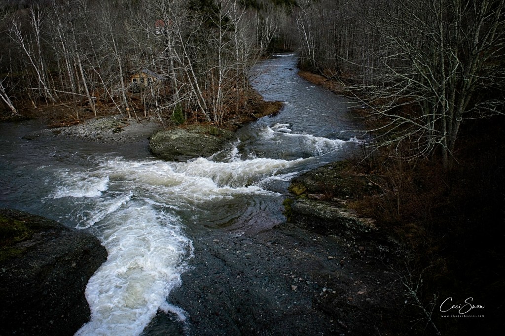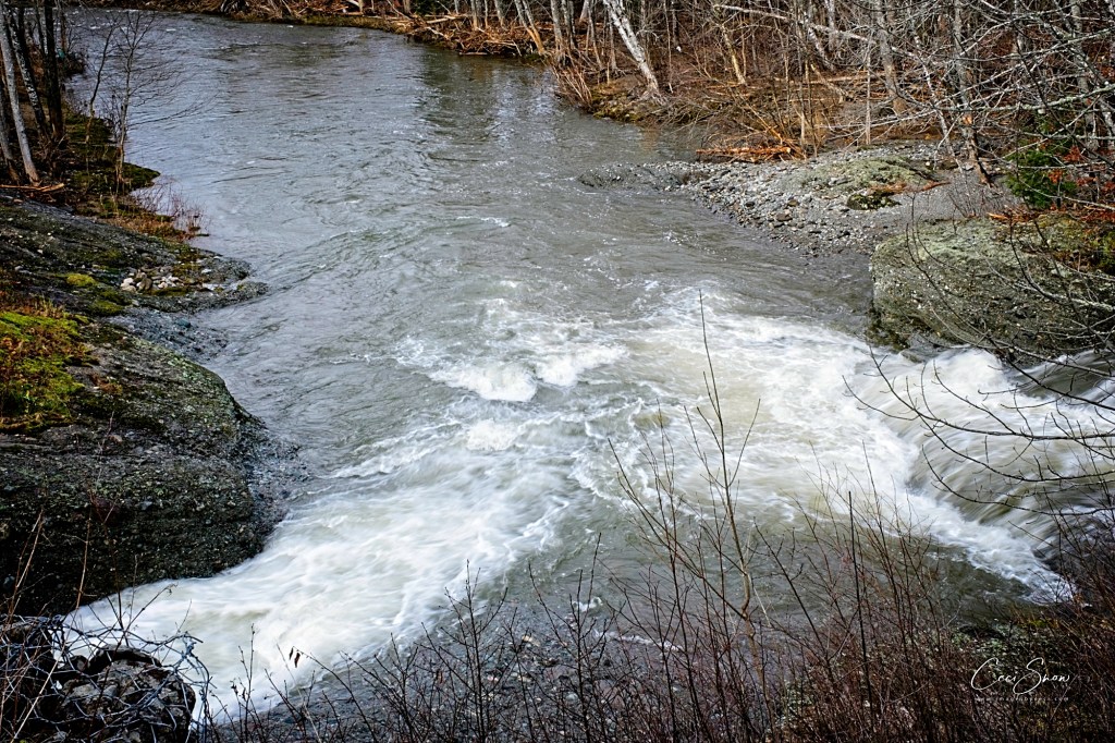This morning I took a drive to a spot called the Waterford Waterworks. At this time of year, the confluence of two streams/creeks would normally be two trickles joining to make a modestly bigger trickle. Today? A totally different situation!