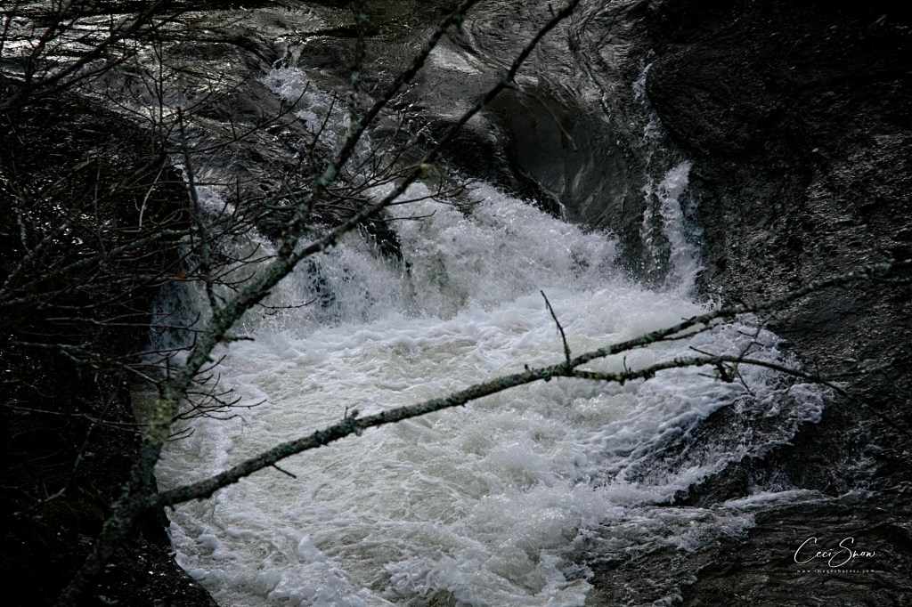 Trout Creek was crashing down the gorge. There is a path leading down to the water’s edge, but today I didn’t dare risk it. The water may have undermined the edge in its rush downstream. So I contented myself with standing on the bridge that crosses over the Creek and taking shots from both sides.