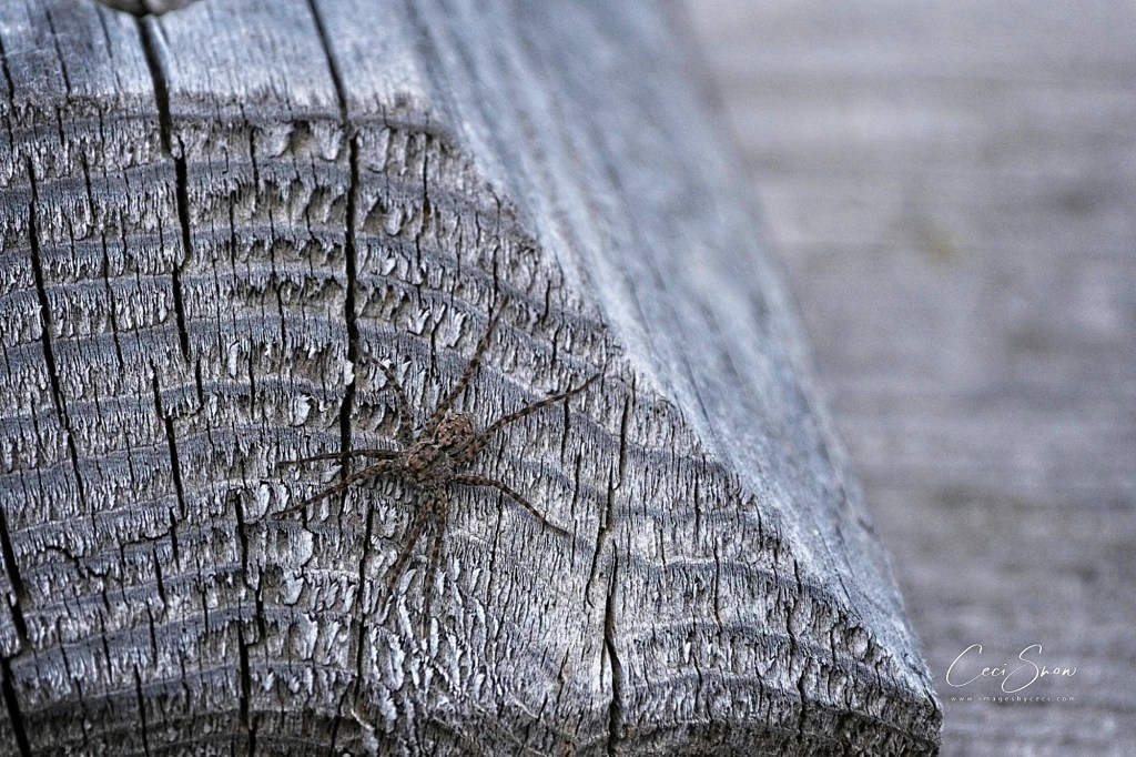 A brave spider was sunning himself on the railing of our deck, probably hoping no birds would swoop down and scoop him up for lunch. I was content to immortalize him in a photo.