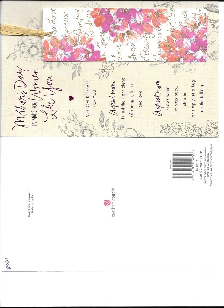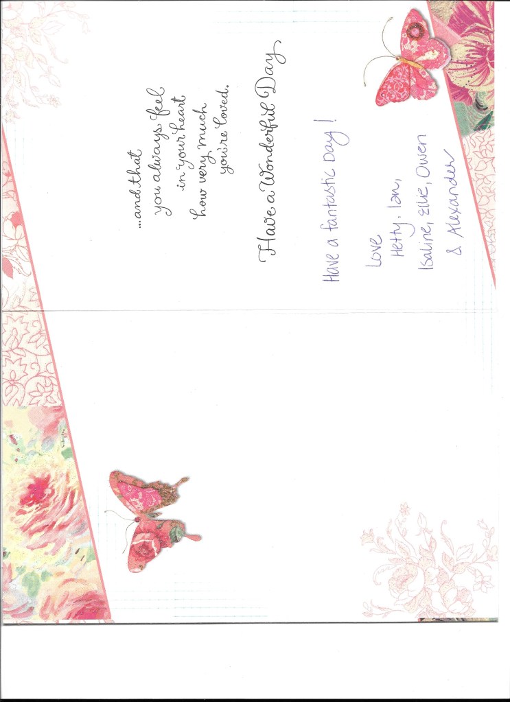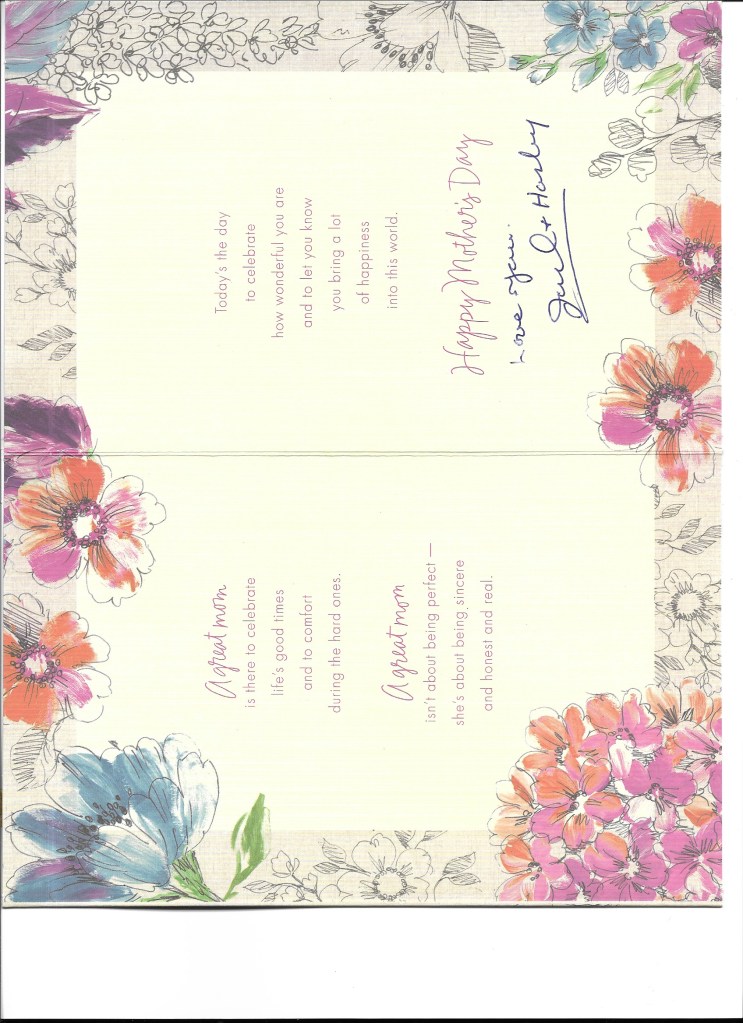 My good friends, the Smyth family, have loaned me their children as my surrogate grandkids and so, on occasions like Mother’s Day, my birthday, Christmas etc. they come to visit. Often they bring a sweet card and sometimes a small gift. This year it was flowers!