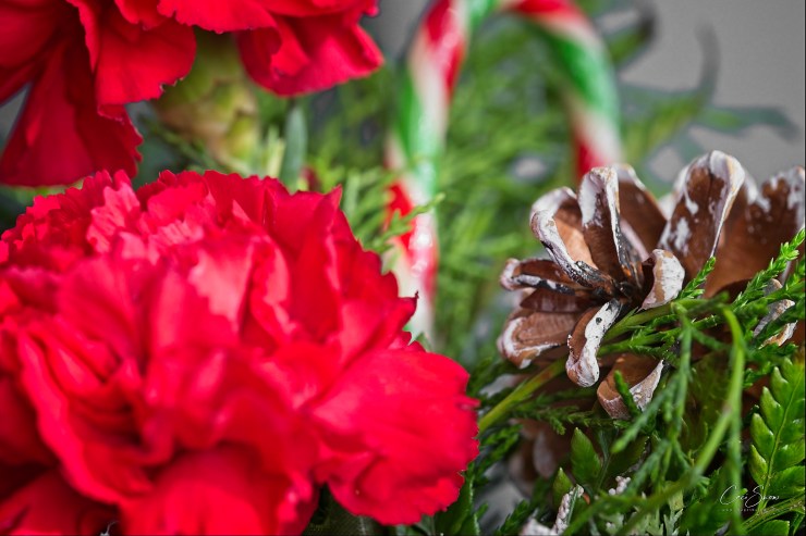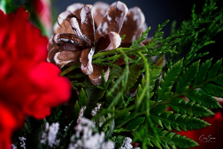 White frosted pine cones and greenery to offset the red flowers and ‘fruit’ provided a perfect balance to the whole arrangement.