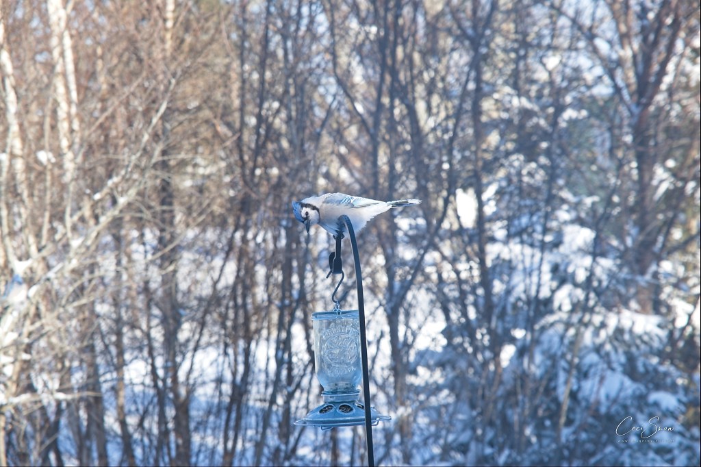 Half a dozen Blue Jays frequent our yard and on this cold day they look like chubby little balls, their feathers fluffed out to keep them warm as they grab sunflower seeds and then fly away to chow down.