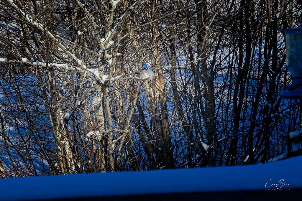 Out on the bushes there are two Blue Jays waiting for my husband do deliver the suet cage!