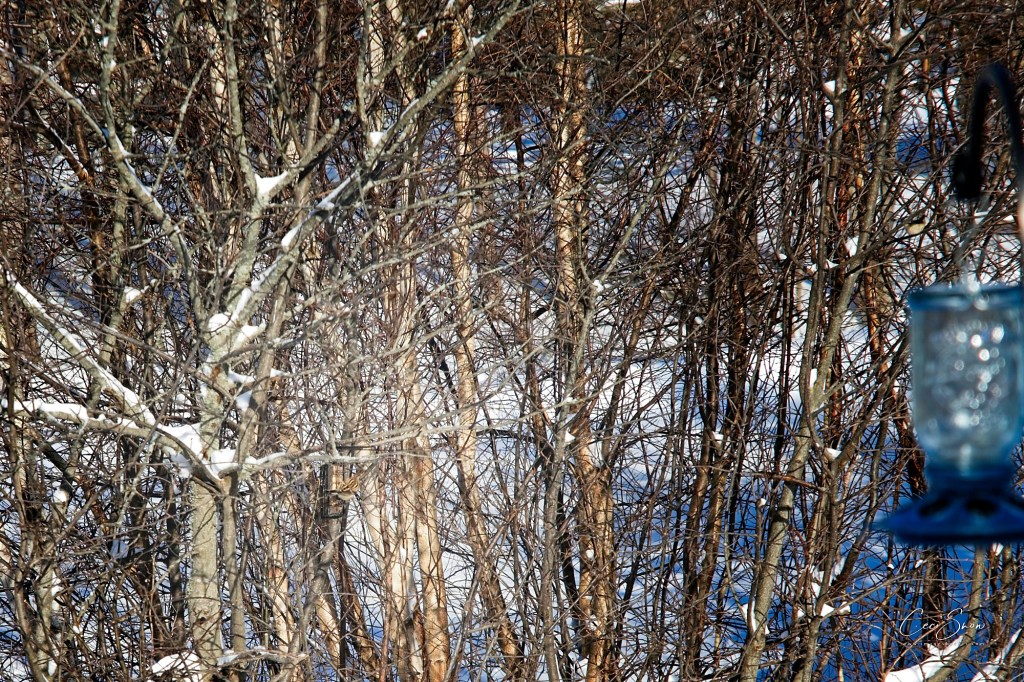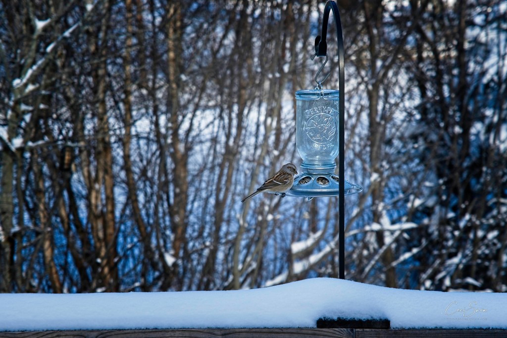 I’m not a true ‘birder’ but I think this is some kind of sparrow. He and his friends hop around pecking at the sunflower seeds too, as well as the smaller seeds in another feeder. On this cold day, they’re all looking for calories to keep them warm.