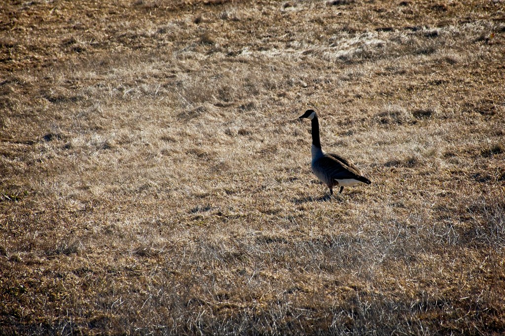 I left and drove down the road on the other side of the field where I spotted one goose. He (or she?) seemed to be walking in ever-larger circles calling out with each step – perhaps looking for its mate?