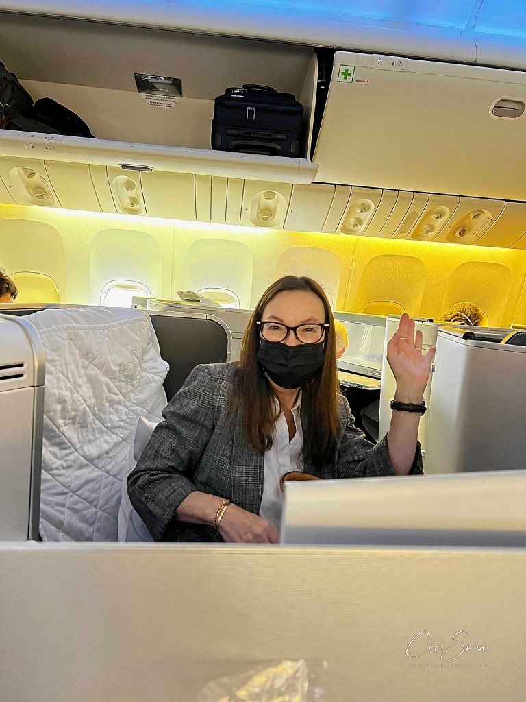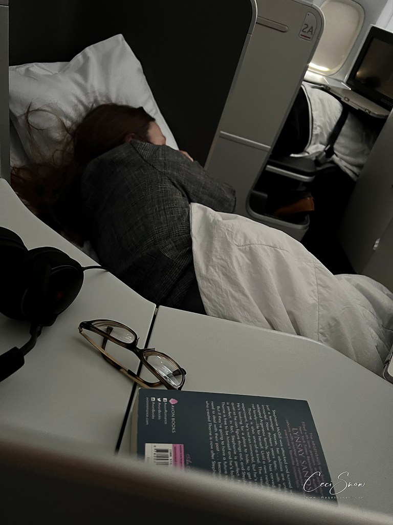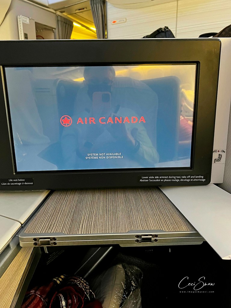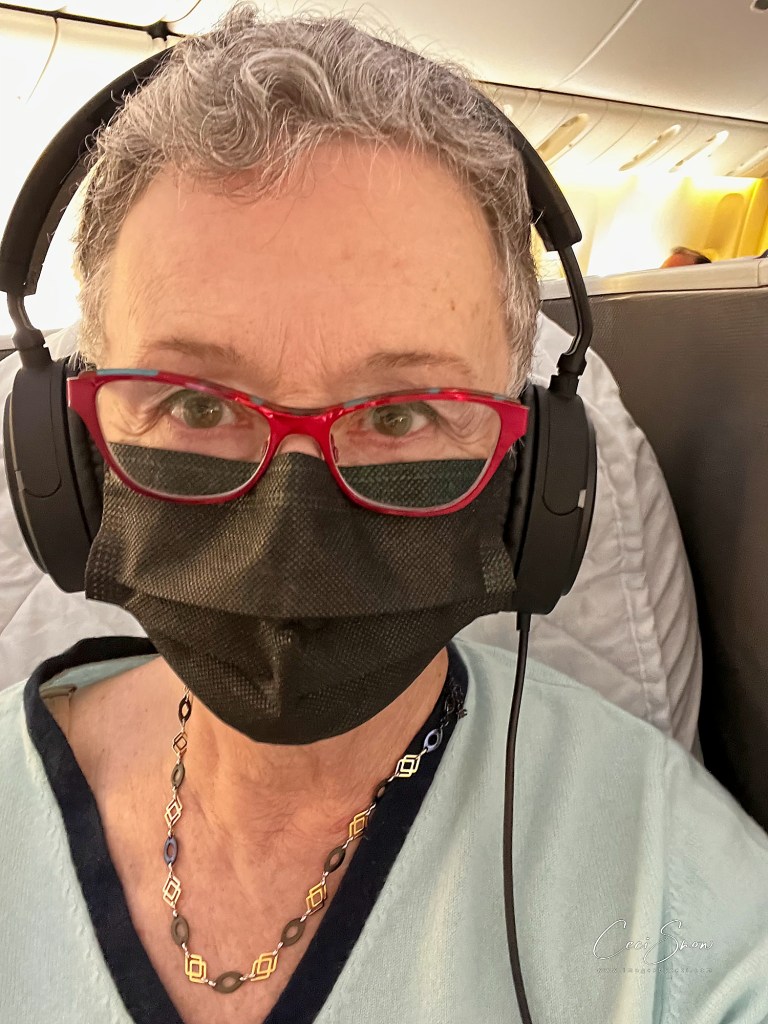 The joys of “Business Class” thanks to Alison and Mike! Space, comfort, real food, actual cutlery (not feeble plastic utensils), personalized service, linen table cloths, a decent-sized pillow, quilted seat cover and duvet for each of us – in other words, luxury travel!