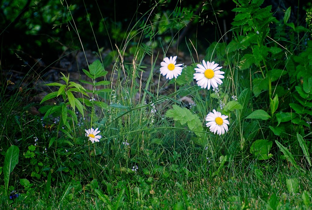 When I headed off on my early Sunday morning bike ride, I spied these daisies peeking out beneath the shrubs at the edge of our lot. They are my favourite (and so cheap!) flowers with their happy faces reaching toward the sun.