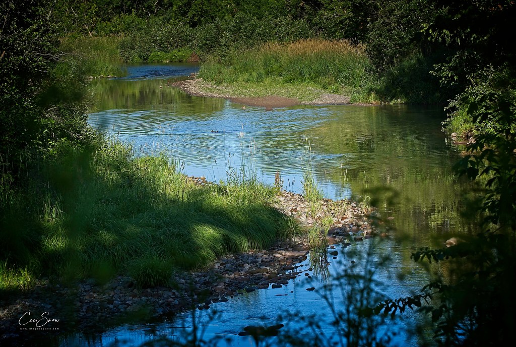 As I pedalled down the hill from our house toward the Nature Trail, the sharp, sweet smell of pine trees filled my senses. Pedalling along the trail, that scent on the breeze was usurped by the scent of cooking grease from the donut factory nearby. I listened to the sounds of the water bouncing over the rocks in the creek-bed alongside the trail, and stopped to grab a photo as a duck landed disturbing the silky smooth water, creating small waves as it swam back and forth.