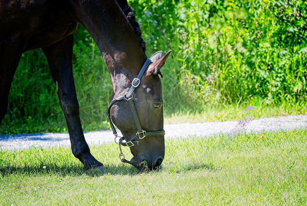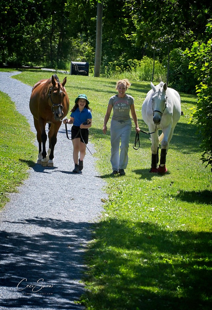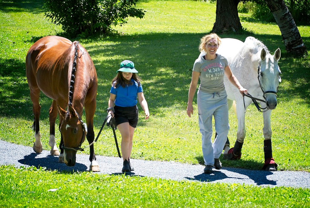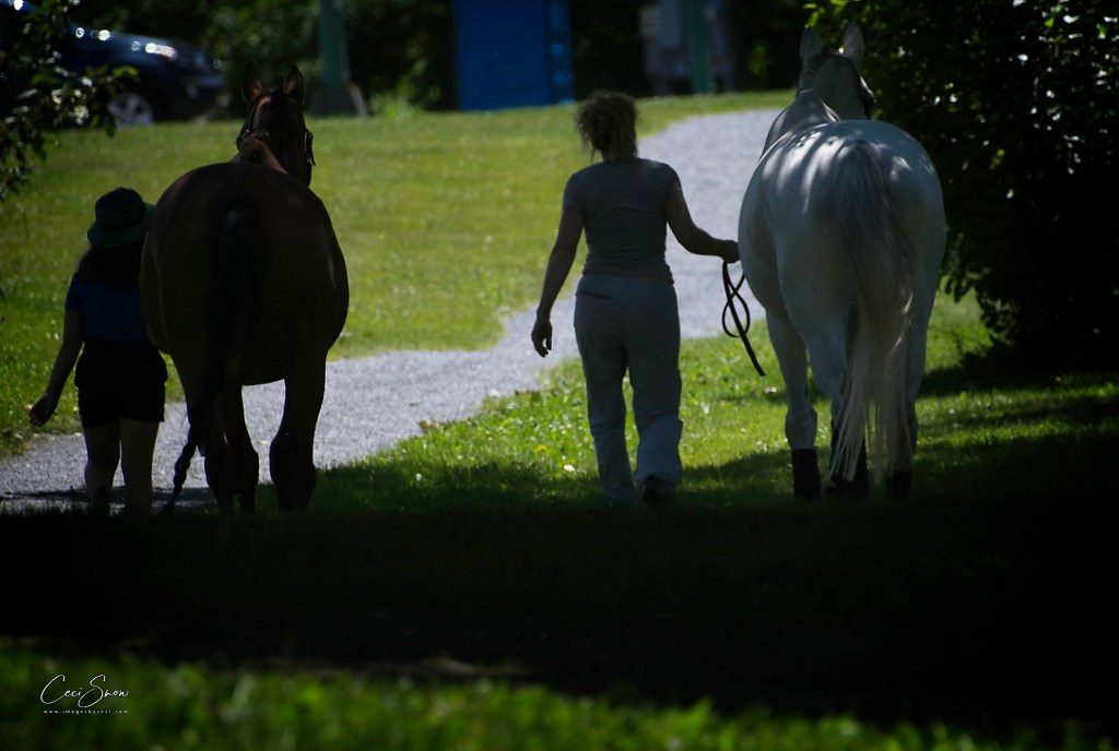 Two friends and a little girl, along with their horses, were taking a break in the park behind PLP, letting the horses graze and relax before the rigours of competition.