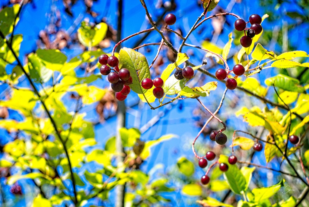 It looks like our family of hummingbirds have departed for points south, but in the meantime, other birds are enjoying the late-summer bounty of berries on the bushes at the edge of our lot.