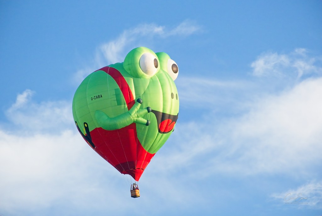Both young and young-at-heart enjoy the spectacle of multiple hot air balloons, some in unique shapes like this, others in the more traditional format, floating serenely across the sky shortly after dawn (or before sunset).