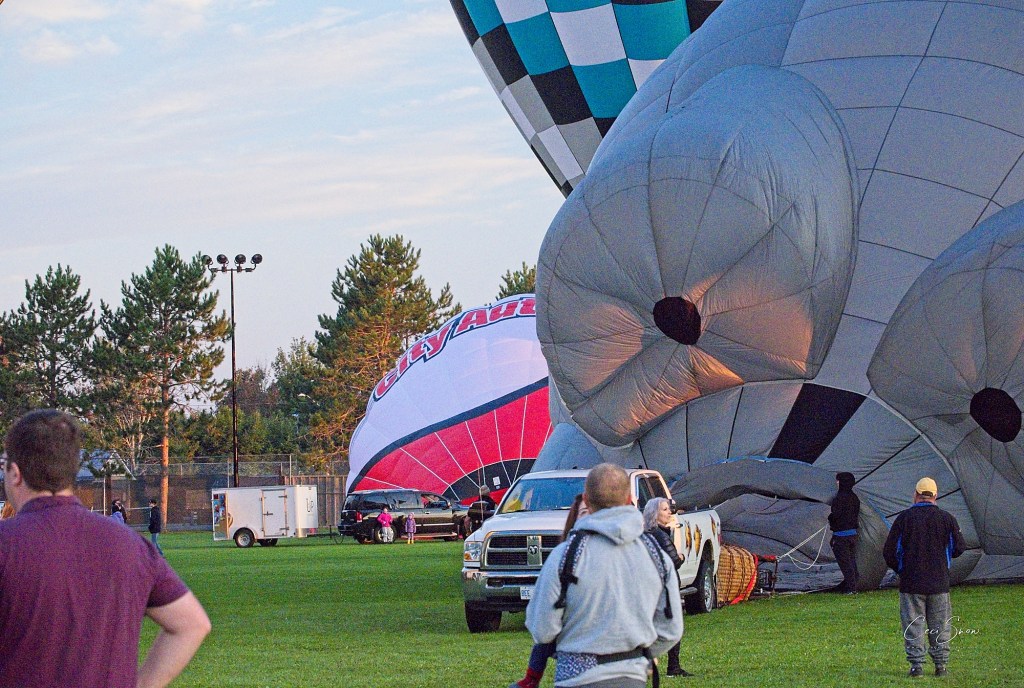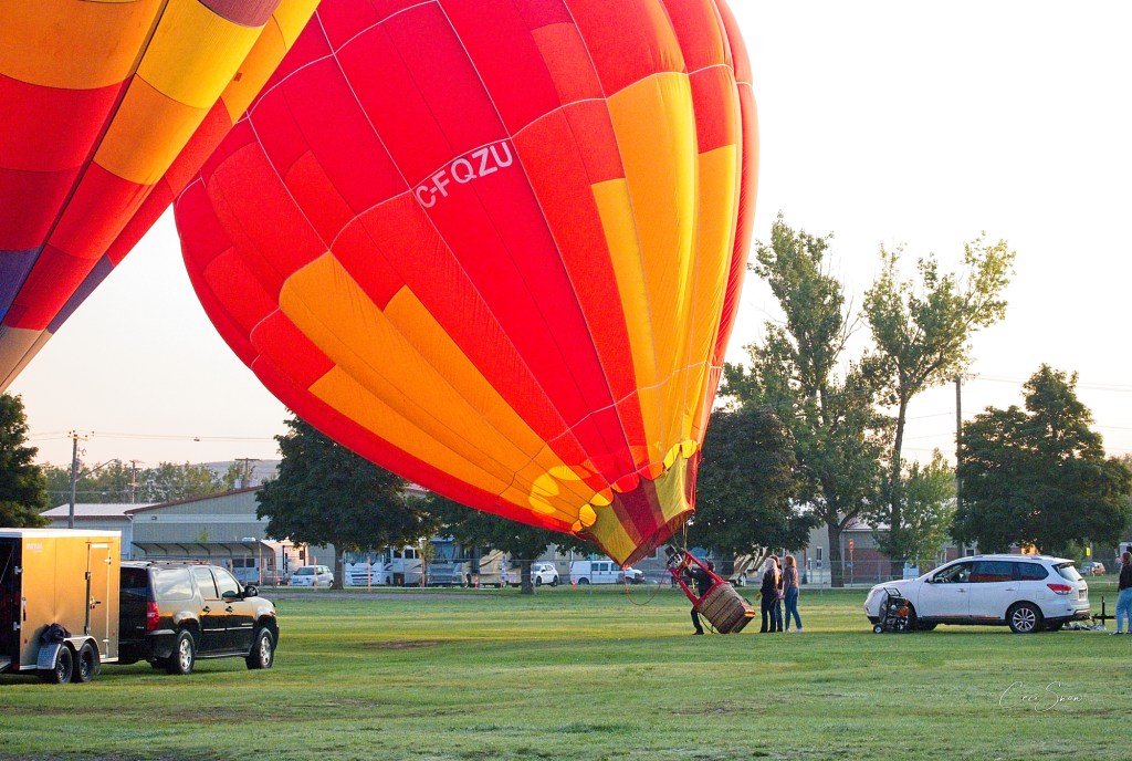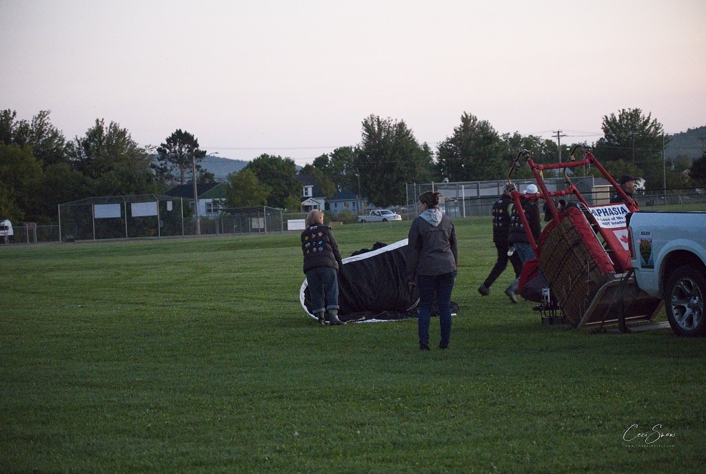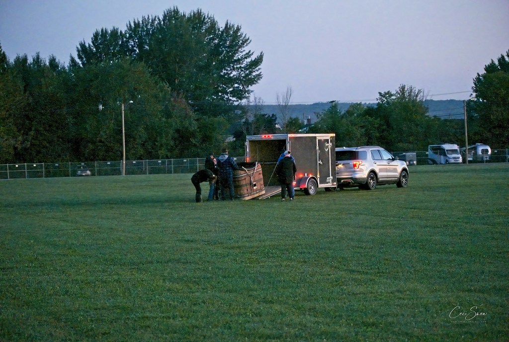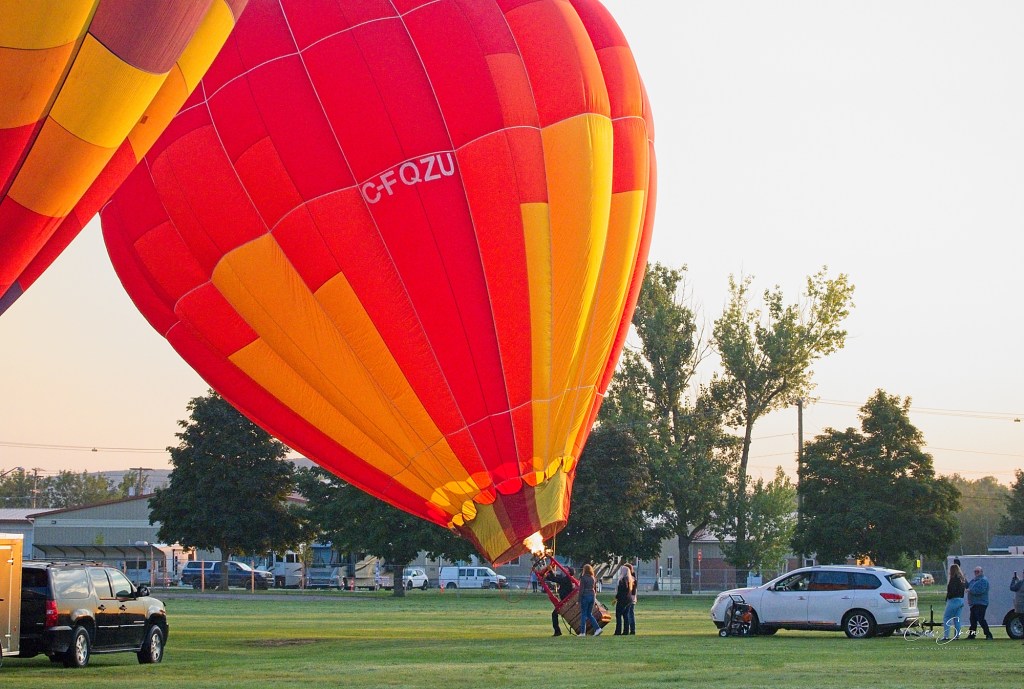 I headed down to the show grounds at Princess Louise Park before dawn, arriving just after 6:a.m. Day was just beginning to break on the eastern horizon. Ground crews, follow vehicles (that would track where ‘their’ balloon was going and get there to help land the balloon, fold it up and tuck it and its basket etc. away in their trailer, and pick up the pilot and his/her passengers to return to the start spot), pilots, passengers and spectators weren’t long arriving.