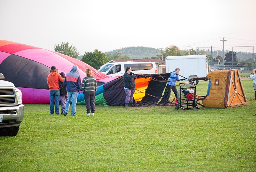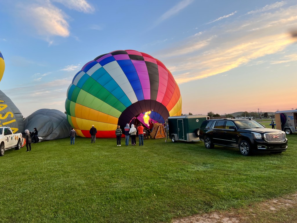 Once that’s decided, pilots are introduced to their passengers and everyone heads out onto the launch field to watch the inflation of the balloons. and to mount the baskets for their flight over the Kennebecasis Valley.
