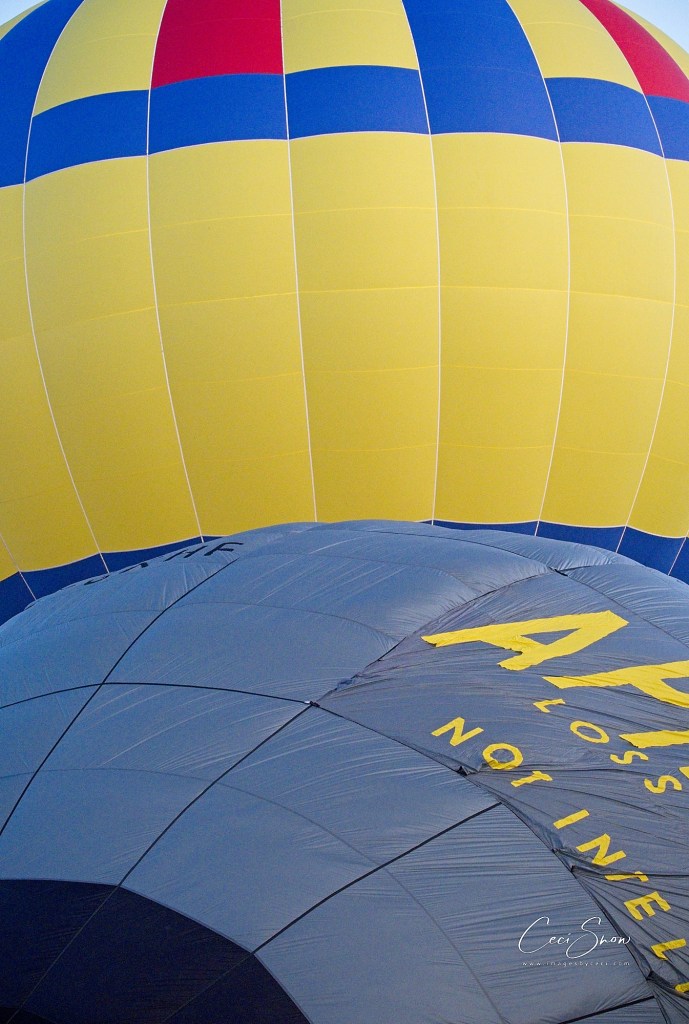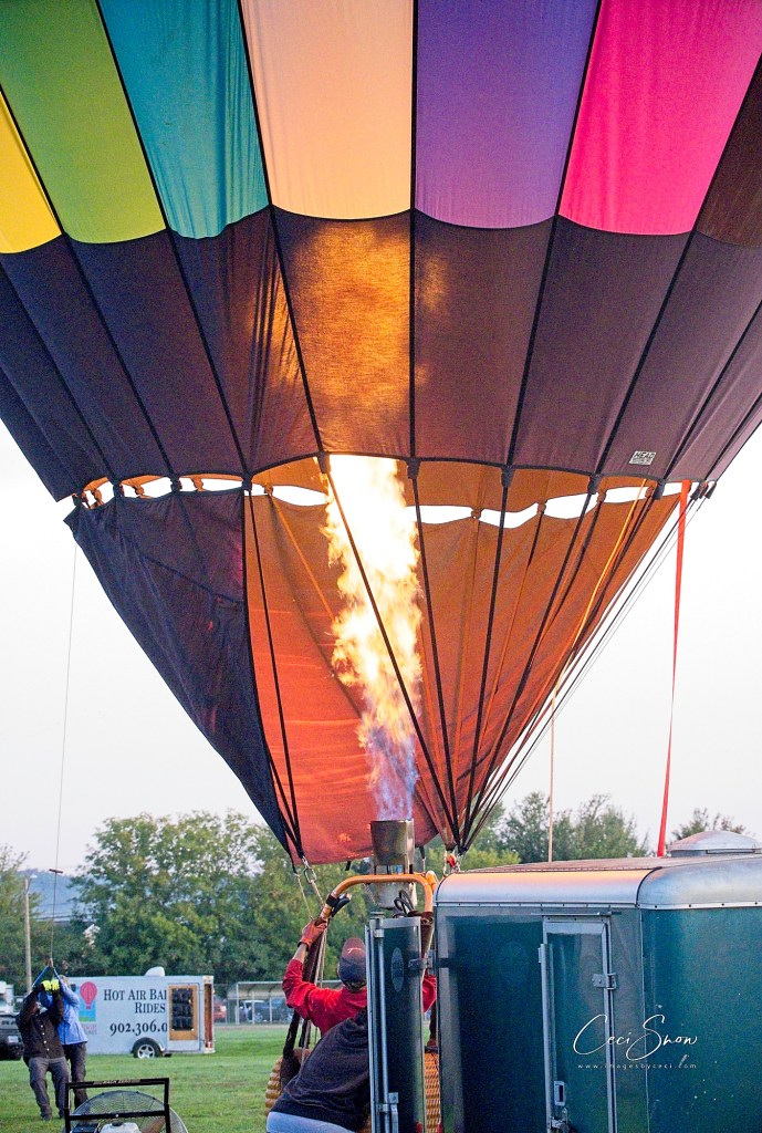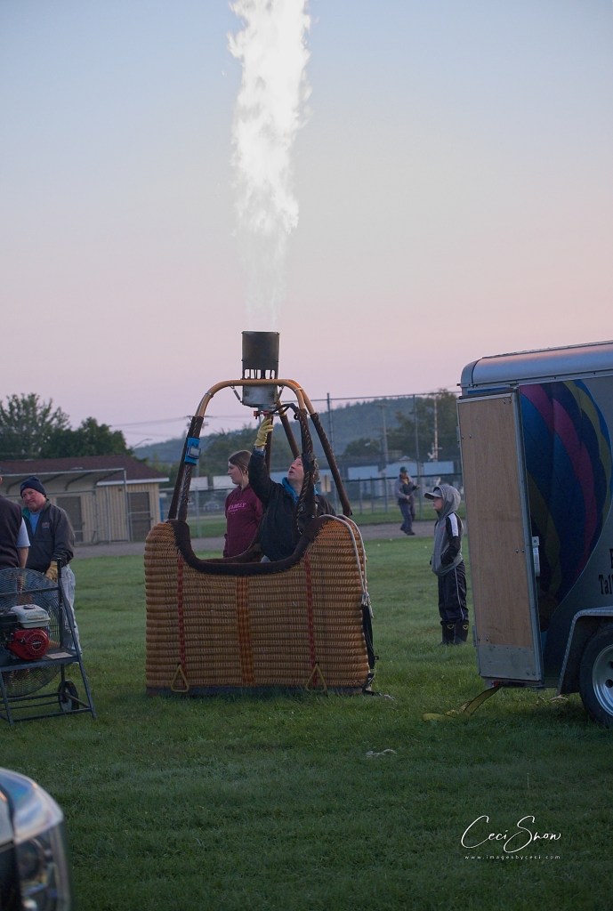 It takes a while. The initial inflation is done with huge fans and then, once the balloon has reached a certain level of inflation, the propane-fired blowers mounted on the baskets are turned on. That’s what is used to keep the balloons aloft once they take off. A crew hangs on to guy ropes to keep the balloon earthbound until the pilot and his passengers are loaded and ready to go. Once released, the balloons rise rapidly.