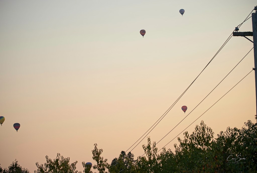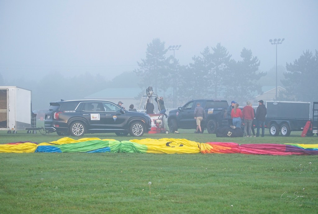 Sunday morning I pedalled down to the launch field hoping for more photos of the balloons going up again. Unfortunately, the fog was like the proverbial British pea soup (or what you might more normally see in Saint John). Although there was no wind, fog poses a true safety hazard in that, when the balloons are aloft, the pilots can’t see well enough and far enough to be able to react to obstacles like power lines. It also makes it difficult to find good, safe landing spots. So, the organizers made the (wise) decision to hold off. The field was full of spectators who were, no doubt, disappointed, but I’m sure they understood It was such a friendly atmosphere. I met a nice couple from Sackvlle, NB, who’d driven down to see the balloons and spend time with some of their grandchildren – adorable triplets!