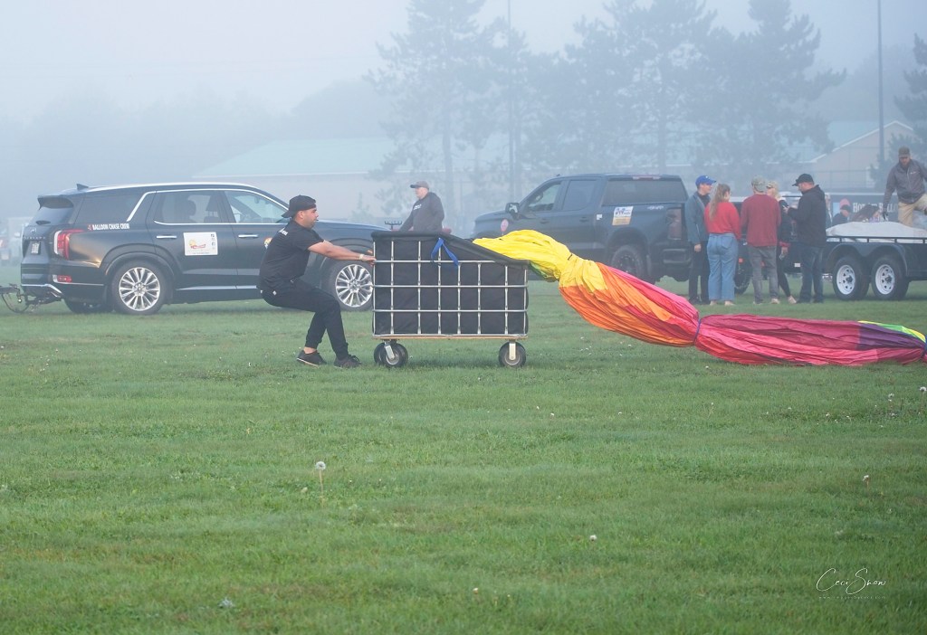 I also spent time chatting with a terrific lady from Ukraine. She and her husband, two kids, and parents live in Moncton but had driven down to see what it was all about. Although the balloons didn’t fly, some inflated so the kids could see just how very huge they really are. We watched one strong young man drag what was obviously a very HEAVY cart through the fog-soaked grass to lay out a balloon.
