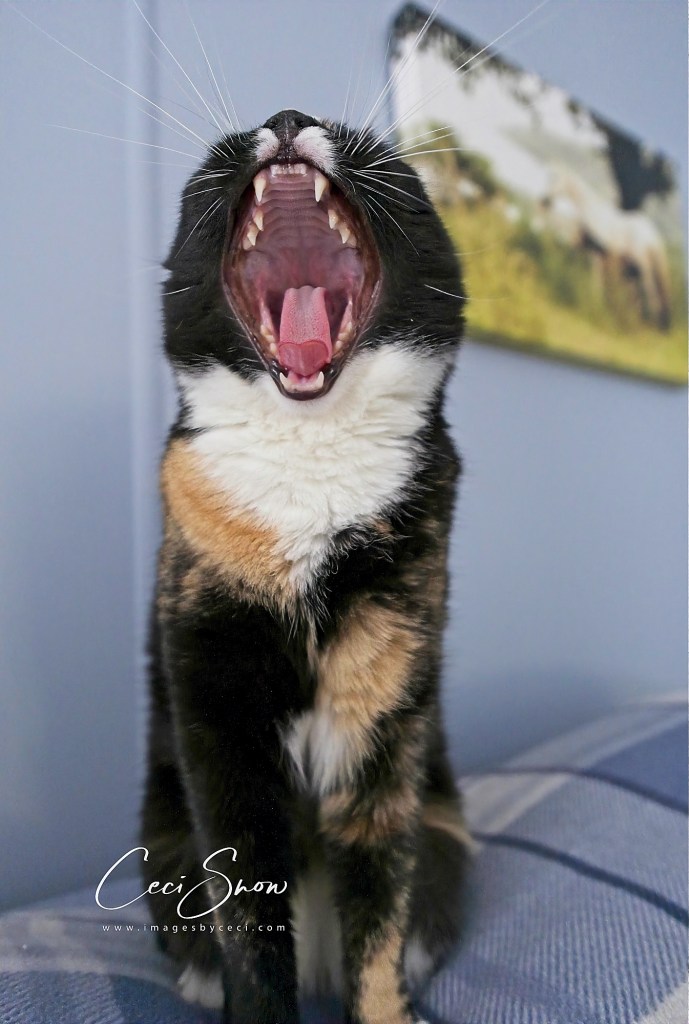 Meanwhile, inside the house, our cat Lucy is doing what cats do – nesting, yawning and being content to stay inside where it is warm, dry and she’s sheltered from the wind.