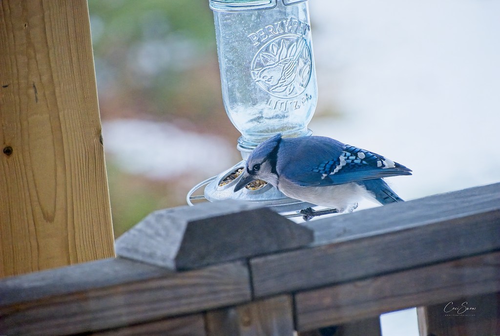 Now that it’s officially winter, we’ve put our bird feeders out on the deck along with a suet block in the trees at the edge of our property. Within mere moments the bluejays knew it was there and descended like a pack of wolves!