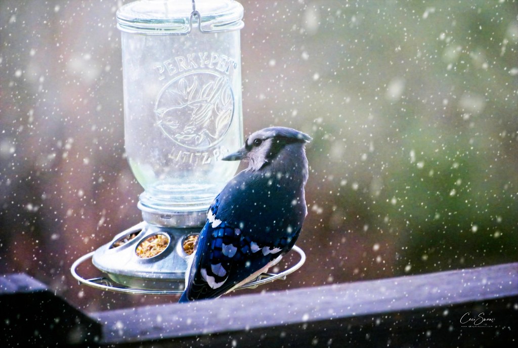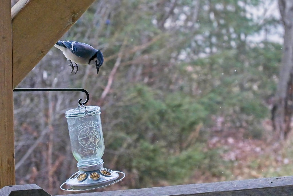 It’s chilly out this morning (slightly below 0ºC) so our local birds are happy to see that there are seeds in the feeders. The Blue Jays are like a pack of feathered wolves descending on the feeders and demolishing the sunflower seeds. There is enough variety, however, to leave some smaller seeds for other birds.
