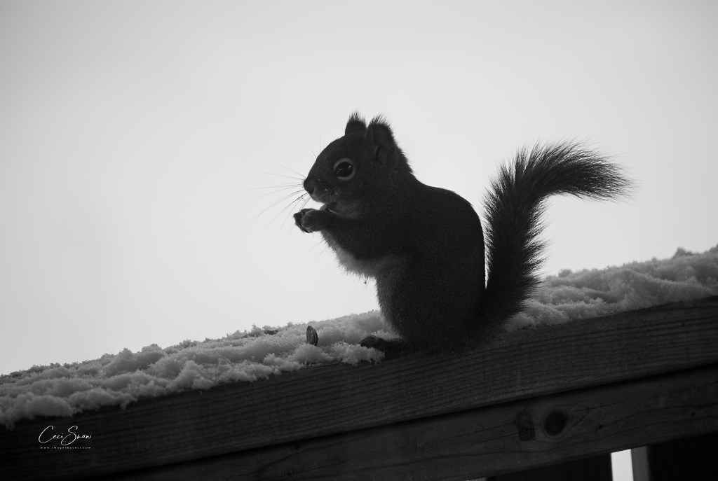 This hungry wee fellow decided he should clean up seeds left behind by the sloppy Blue Jays who’d been lounging on our bird feeder.