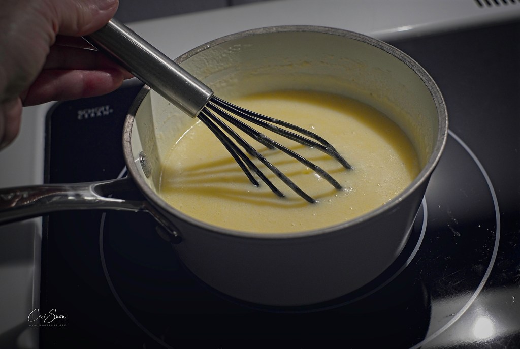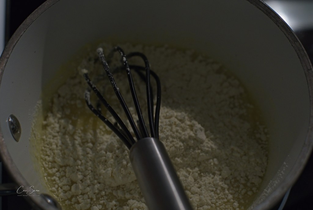 First, I got the sauce going. Melted a 1/2 cup of butter and started whisking in the mix.