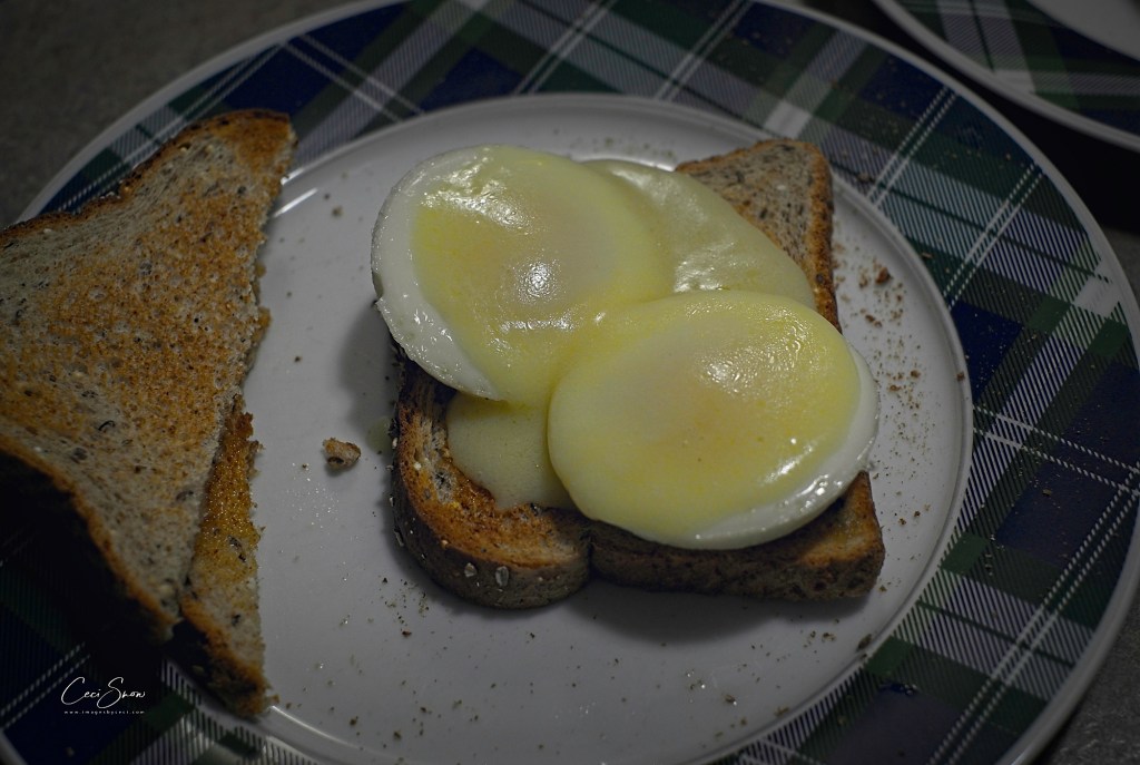 The end result wasn’t a truly traditional “eggs benny” as I didn’t have any English Muffins in the house, nor did I have any ham or smoked salmon to dress it up. Instead, we had poached eggs on toast with Hollandaise sauce. It was delicious!