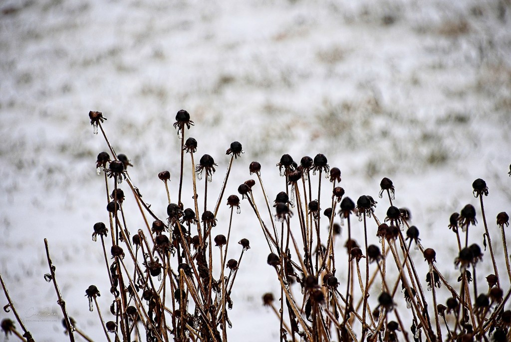 The birds have pretty much stripped the seed heads on the black-eyed Susans and they stand out against the crispy white lawn behind.