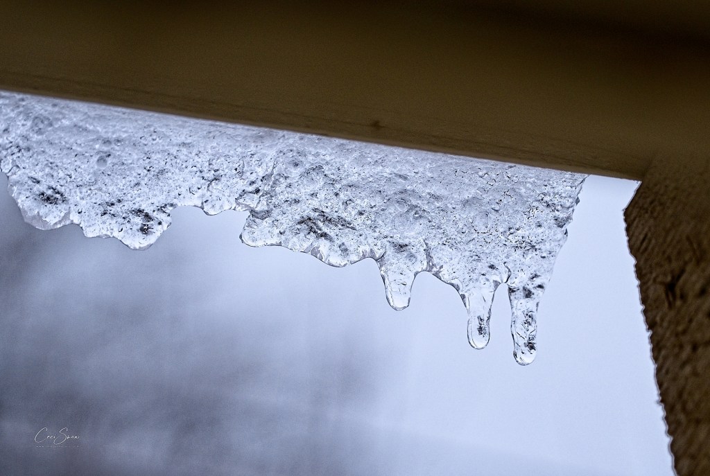 And melting icicles are sliding off the metal roof over the pergola above the deck.