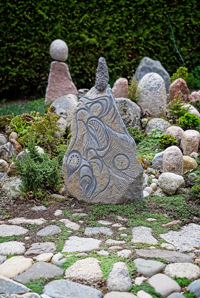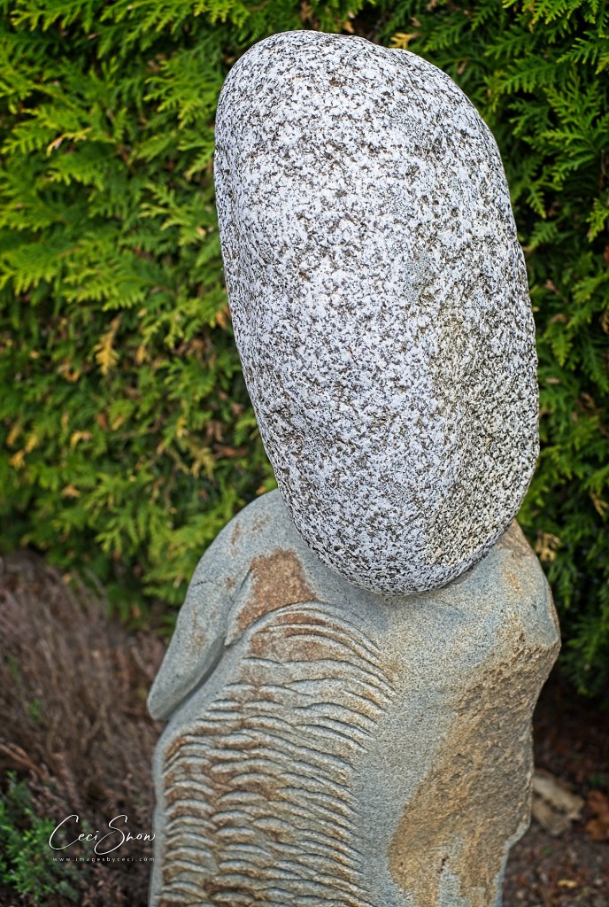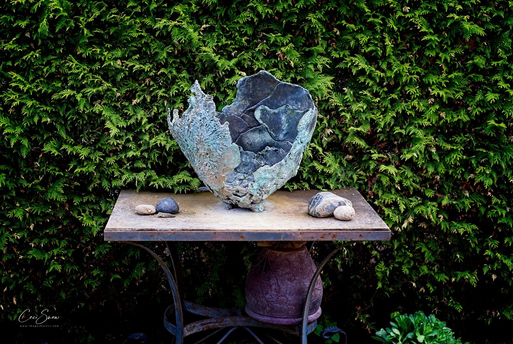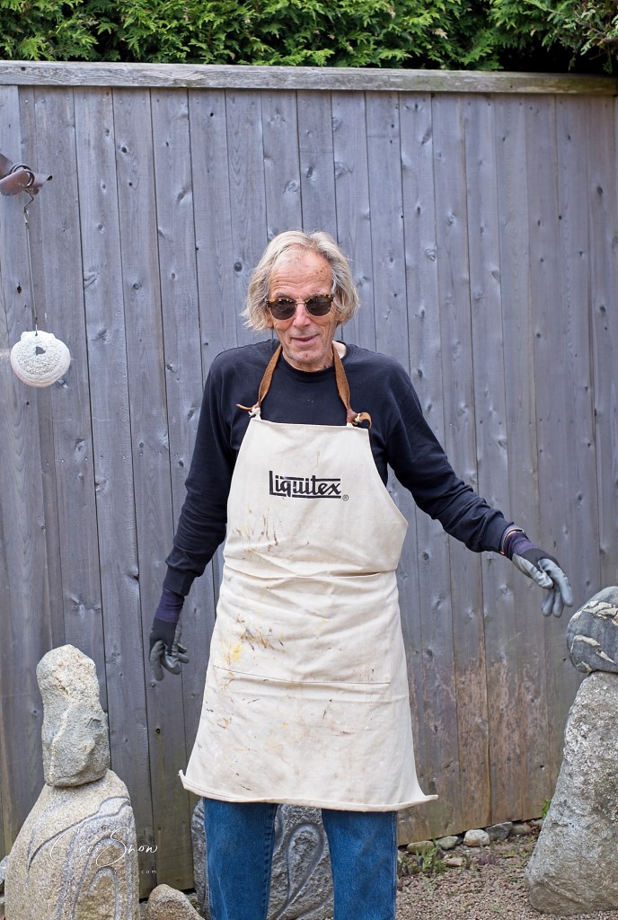The shop, studio and amazing garden were created by, and are operated by, Gail and Steven Smith, along with their canine companions. Gail gave us a tour of the shop filled to the brim with Steven’s creations as well as an eclectic assortment of other items both useful and whimsical, depending. Then, Steven took us on a detailed tour of his garden, a tribute to Gail. Surrounded by a 12′ high hedge and fence, it is home to his incredible stone sculptures, a curated collection of shrubs, trees and plants, numerous hummingbirds and hundreds of honeybees from a local apiary who visit for a drink of water. It is truly incredible and there are amazing things to discover on every inch of the small space.