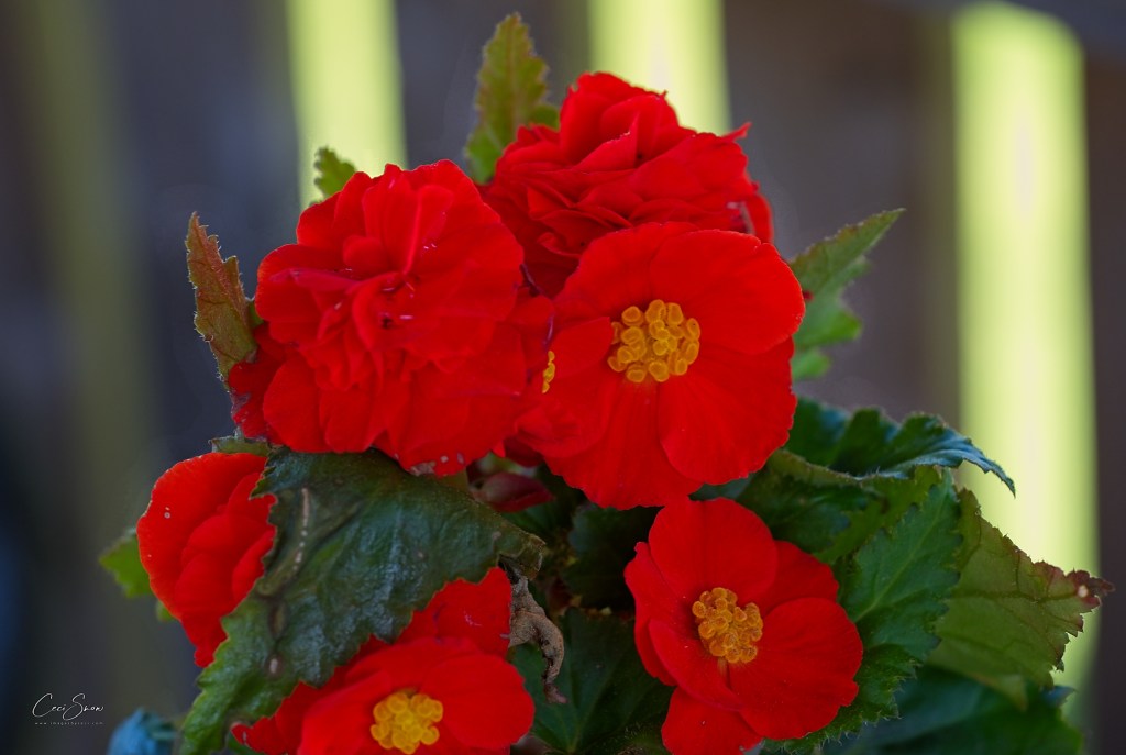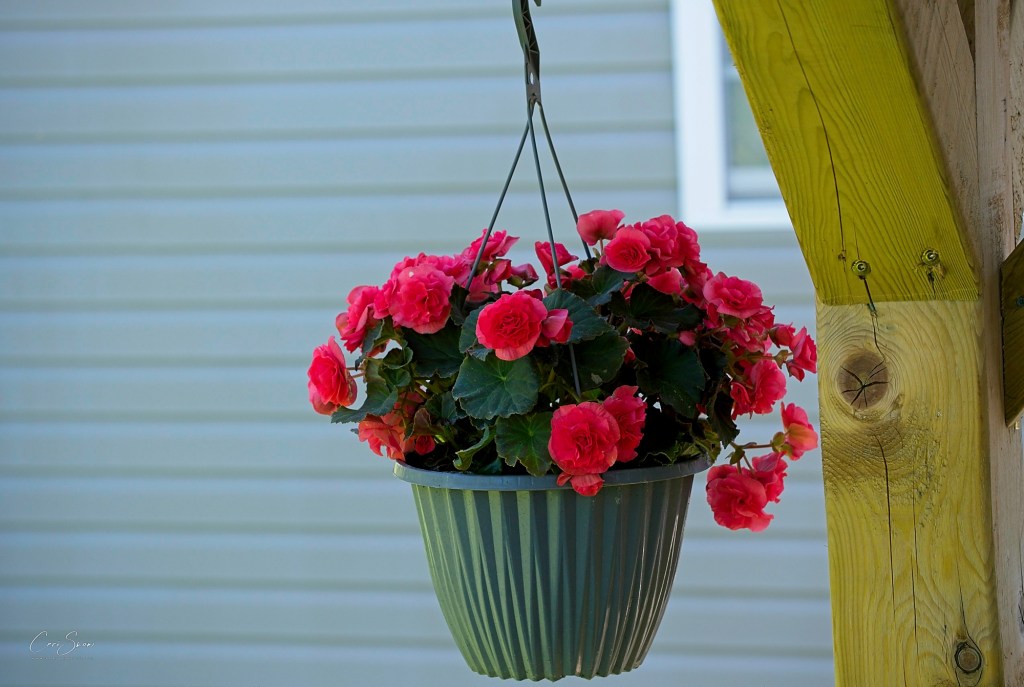 The planters are hung from the frame of the pergola, and begonias are showing off everywhere!