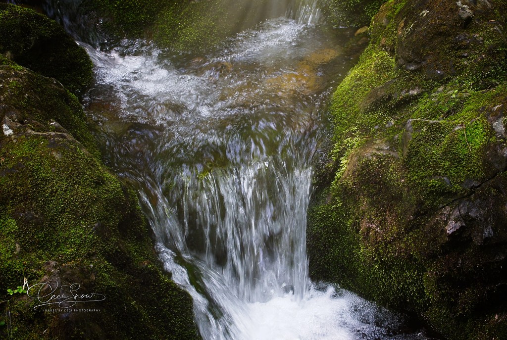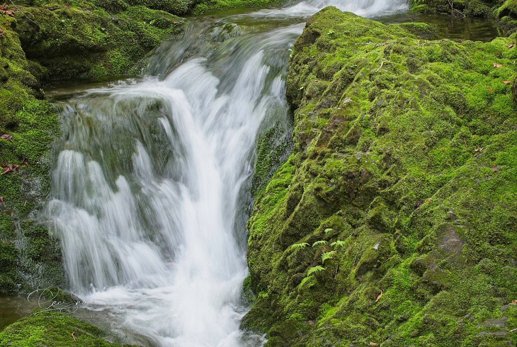 In the time that I was (slowly and carefully) exploring the trail, the sun came out and filtered through the trees, lighting water, moss, lichen and ferns with a golden glow.