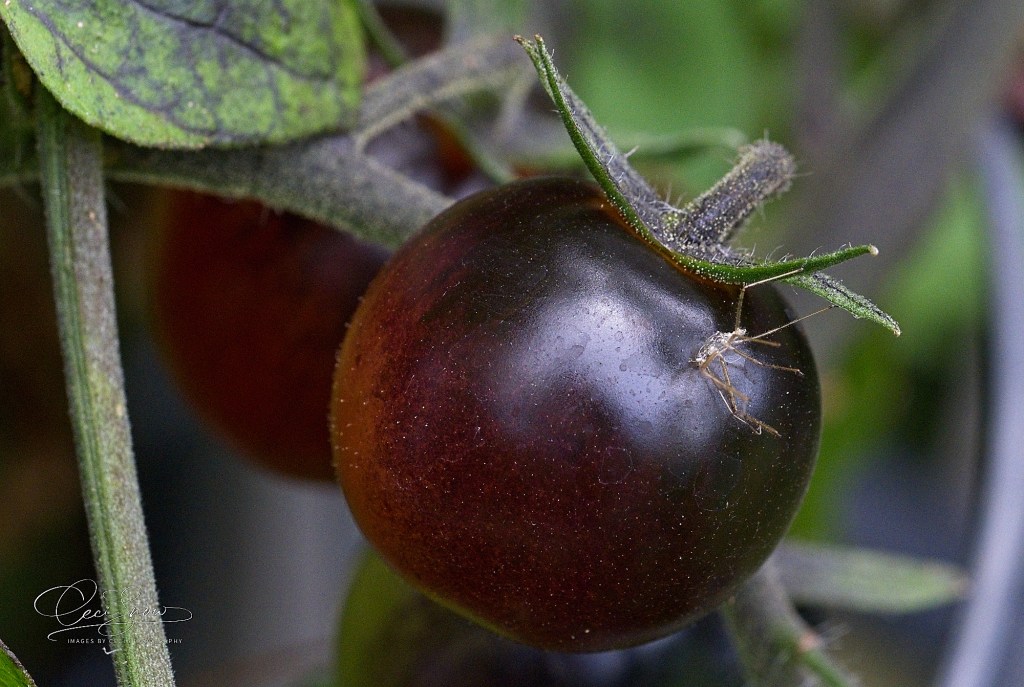 I planted a couple of different varieties of cherry tomatoes. These have gone from green to almost black and are just beginning to ripen to a dark red.