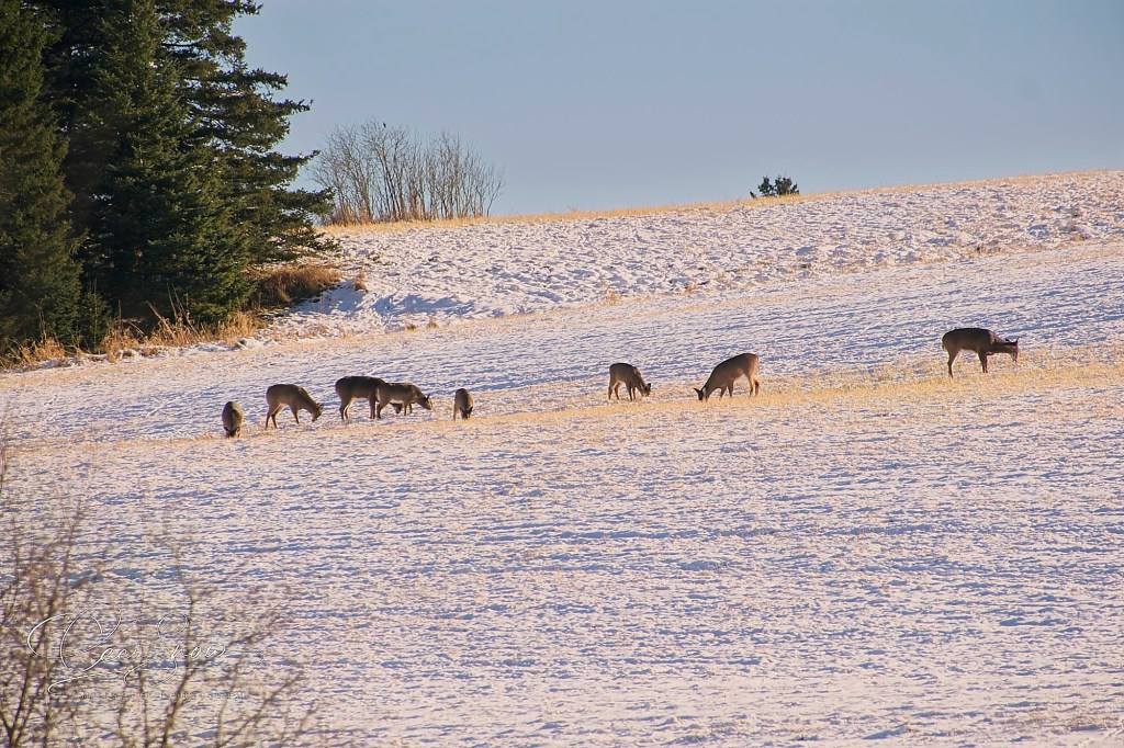 The deer are enjoying the minimal show cover as it makes it easy for them to graze on the stubble in the hay fields. Access to food in the winter is a major issue for them when the snow is deep and the temperatures are frigid.