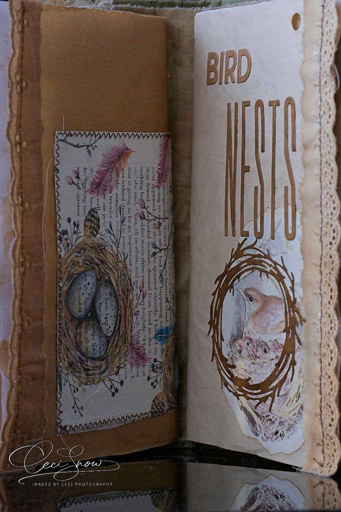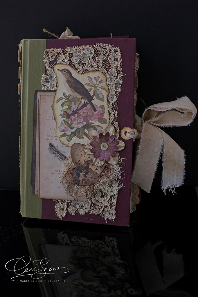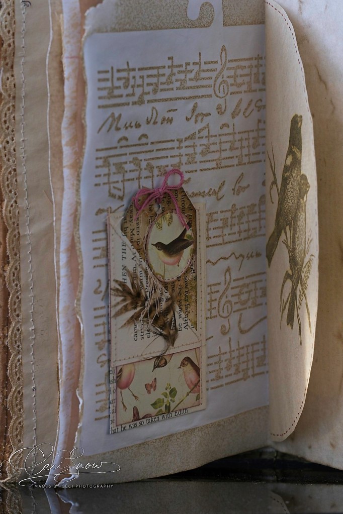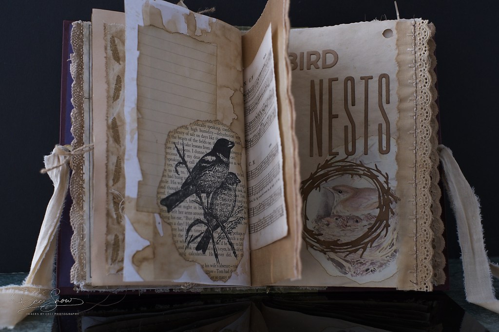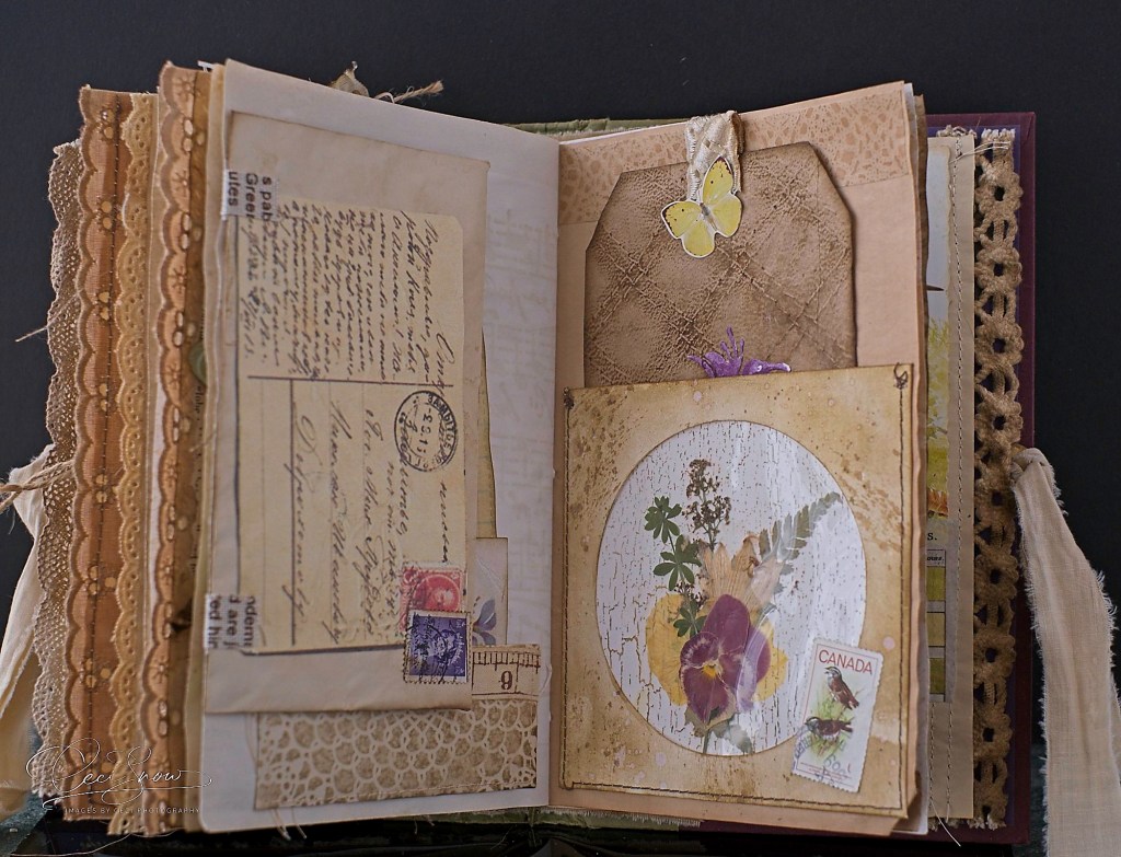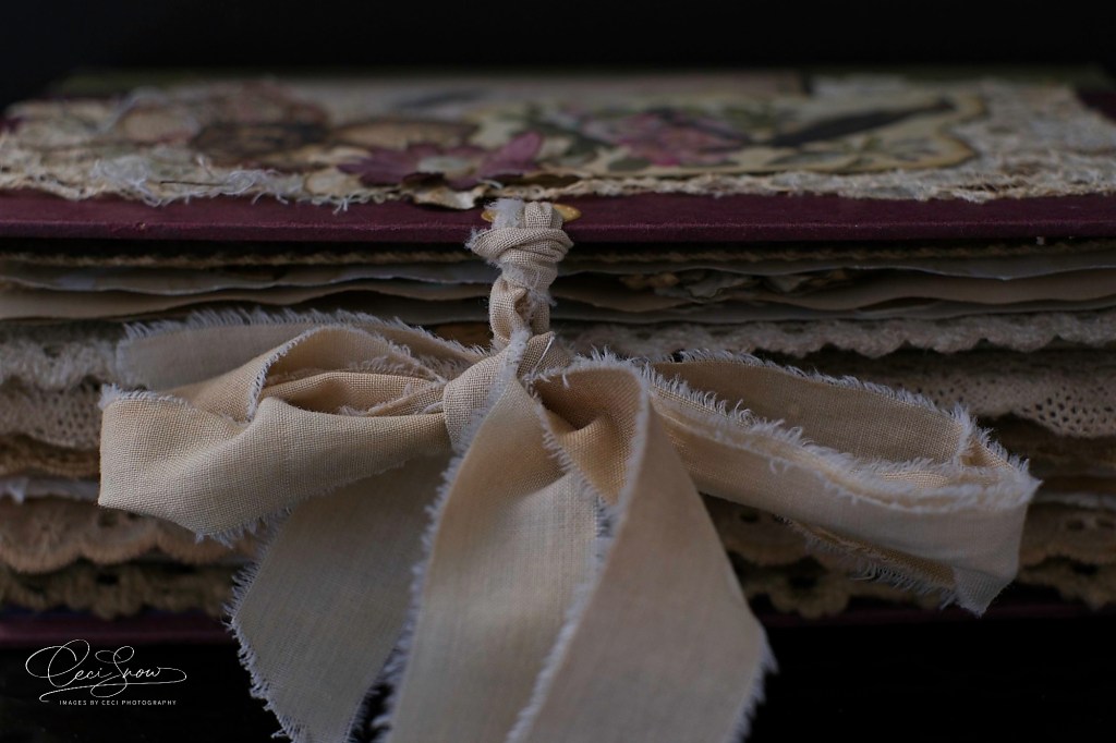Looking through it is a different and tactile experience with the rough edges of the papers, the lace, the ribbons and ropes, torn linen ribbon to tie it shut.