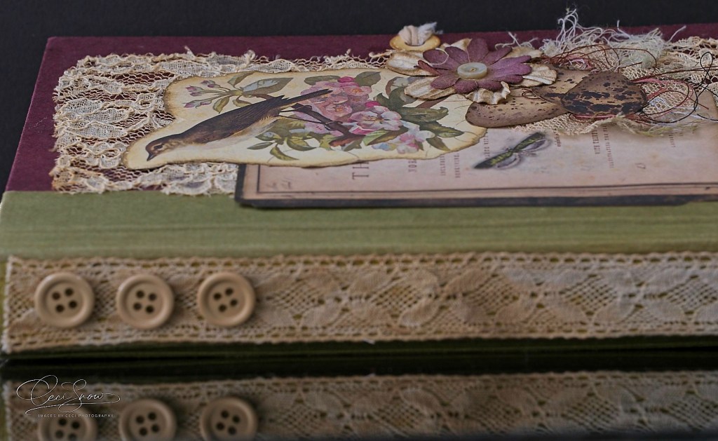 Old buttons and old lace mark the binding.