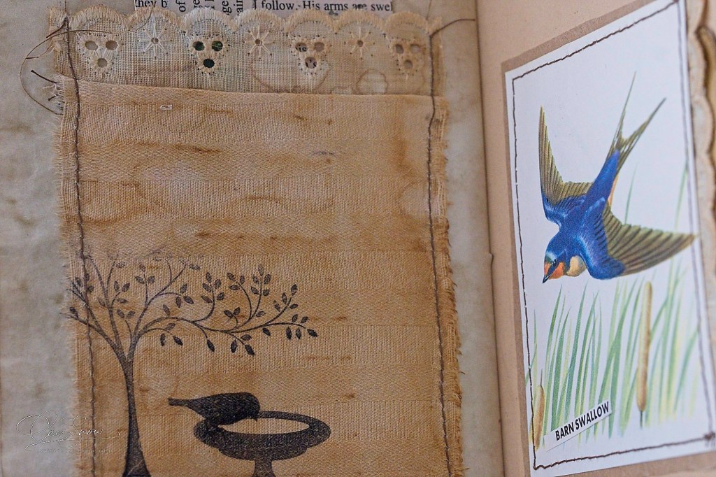 Birds, bird bath, grasses and a tree, gently swaddled in more lace.