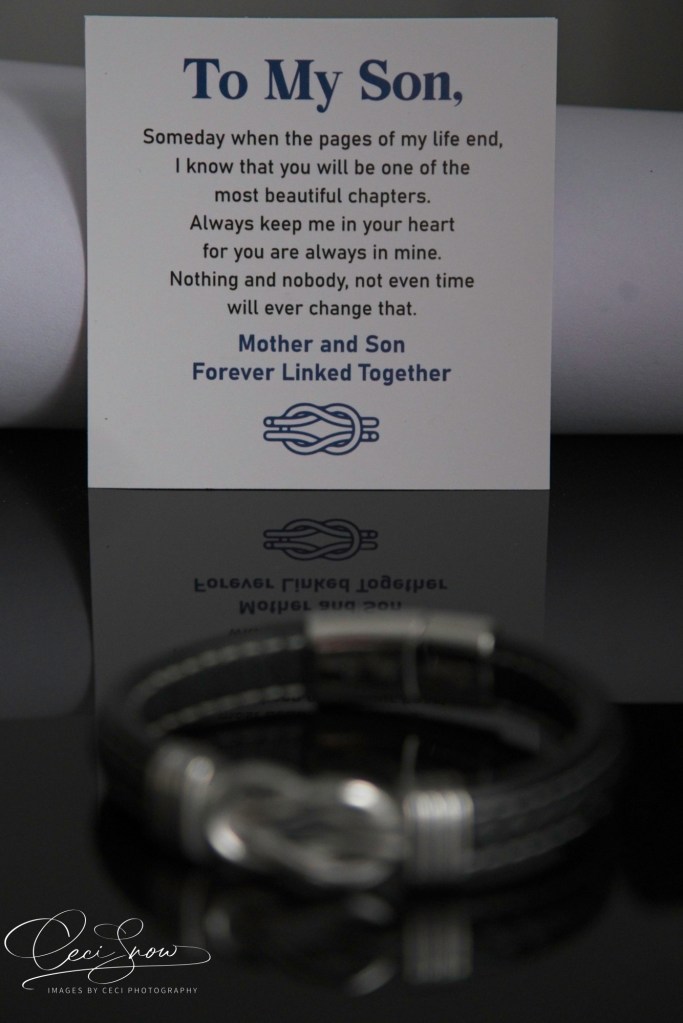 David turned 50 in September of this year. I gave him a gift to remind him that, no matter how old he was, he was still my little boy and the mother-son bond could never be broken. Among the other things that I gave him (and the usual sentimental, tear-inducing cards), was a special bracelet that he proudly wore while I was there.