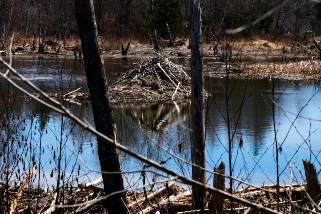 The beaver pond down the road from our house seems to have stabilized behind the dam, although the beavers do have some repair work to do around the base where water is still cascading through. Hopefully, they won’t totally denude all of the trees in the area.