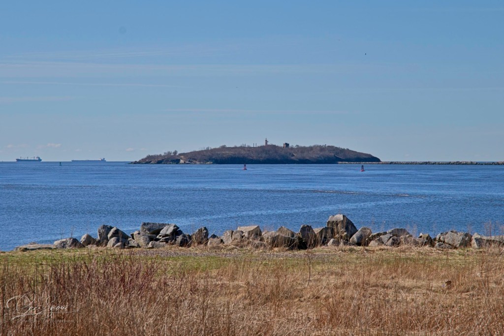 Since it was a clear day it was fun to watch a tugboat heading out around he island to meet up with a ship on the far side.