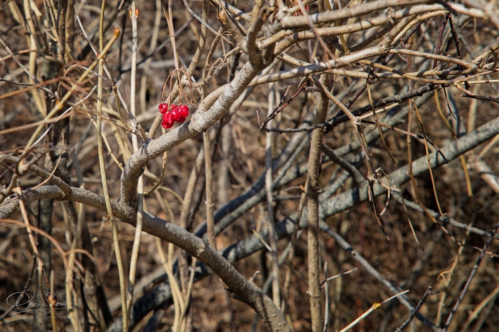 A lonely clump of choke cherries somehow missed by the birds last fall stands out among the branches not yet hidden by any leaves.