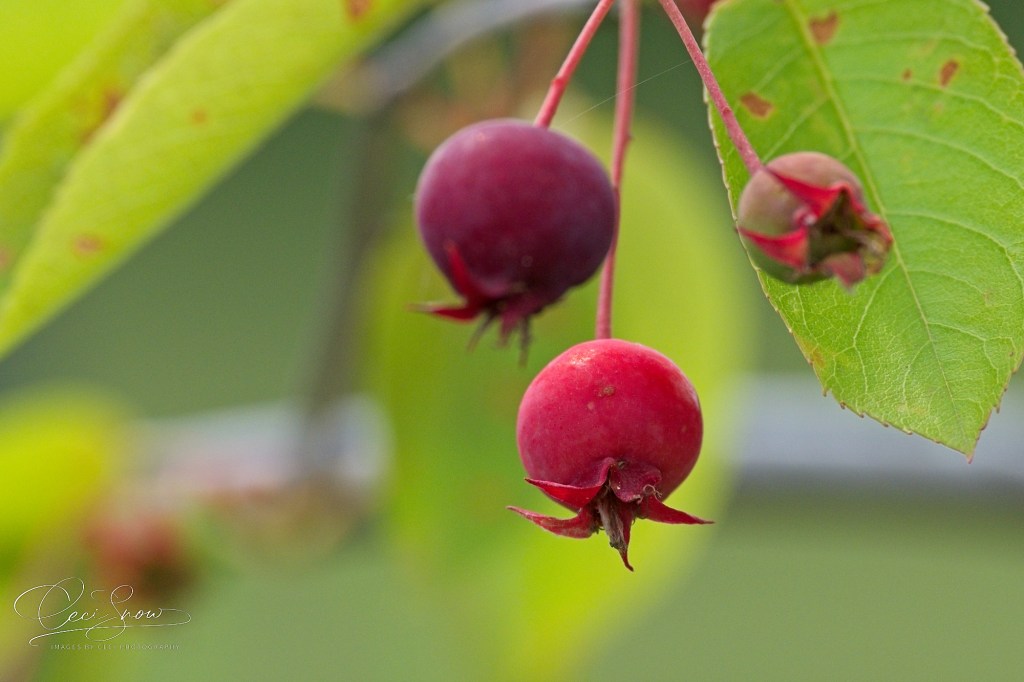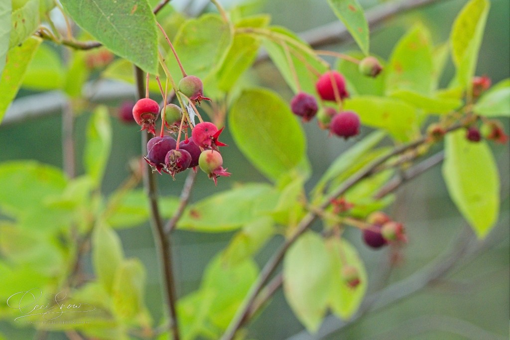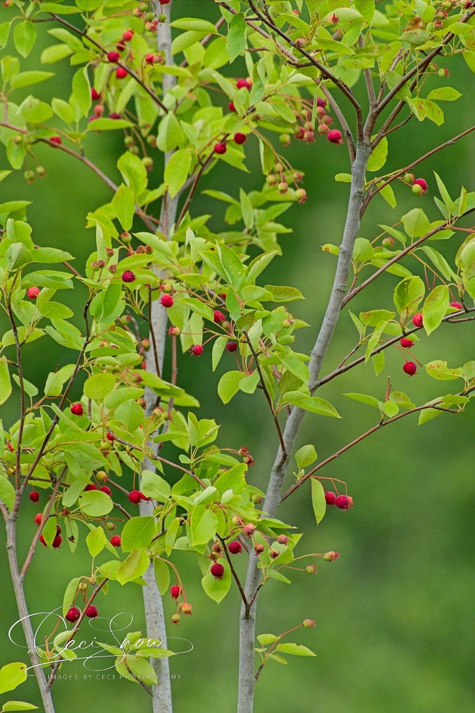 Then, I took a jaunt up to the Trail where David’s and Samantha’s memorial trees were planted. Both trees survived the winter well and now are laden with berries – living up to their name “Serviceberry” tree.