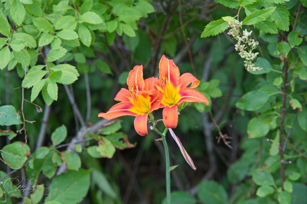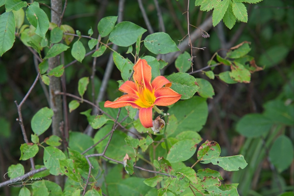 Back in my own yard, I checked on the day lilies. A while ago one appeared – and vanished. The next day there were two. After that? Three. And today there were five! There were two groups of two blossoms and a single. Living up to their name, they’ll be gone tonight – but perhaps there’ll be more tomorrow – who knows?