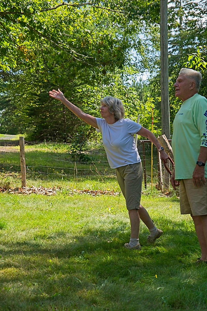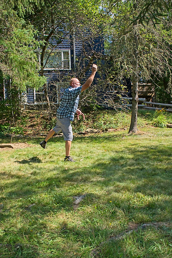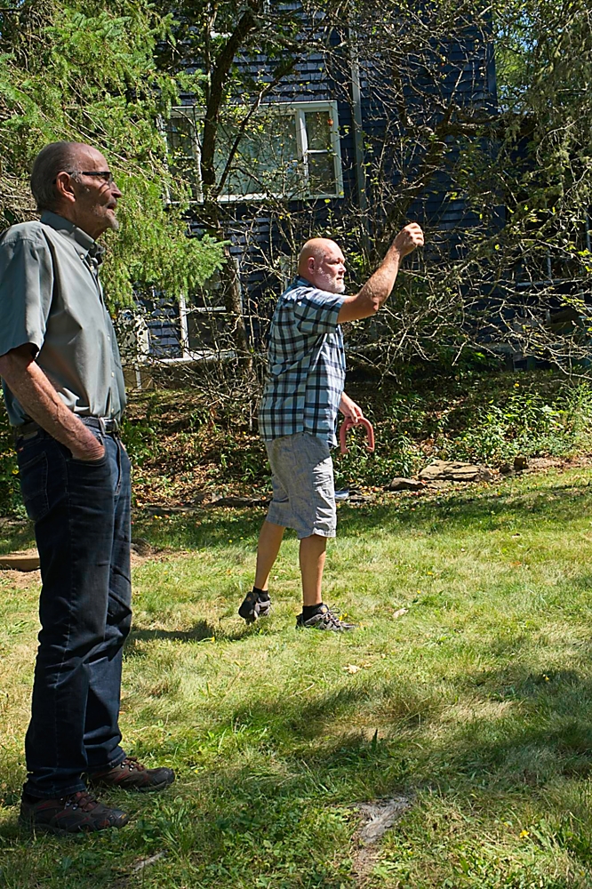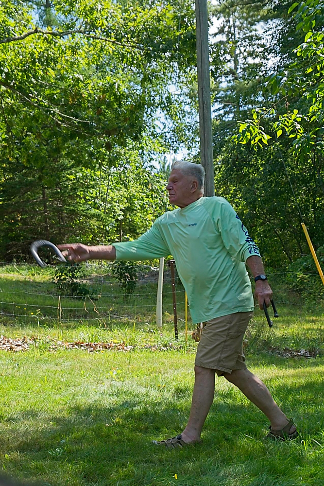 The challenge was issued; eight intrepid athletes, a score keeper and a judge responded. They gathered on the shore of Washademoak Lake for a tournament to end all tournaments. Horse shoes (of the draft horse variety) went flying in all directions. Sometimes they landed in the pit. Sometimes they ventured into the bushes. Other times, they landed flat on the grass or bounced across the pit to land behind or beside it.