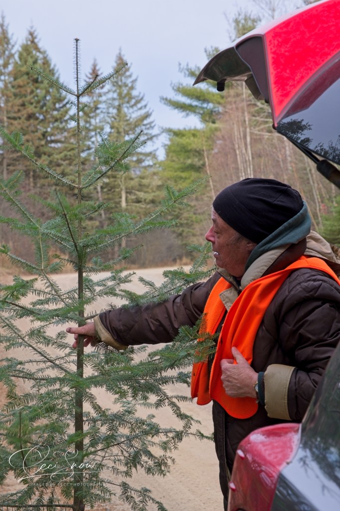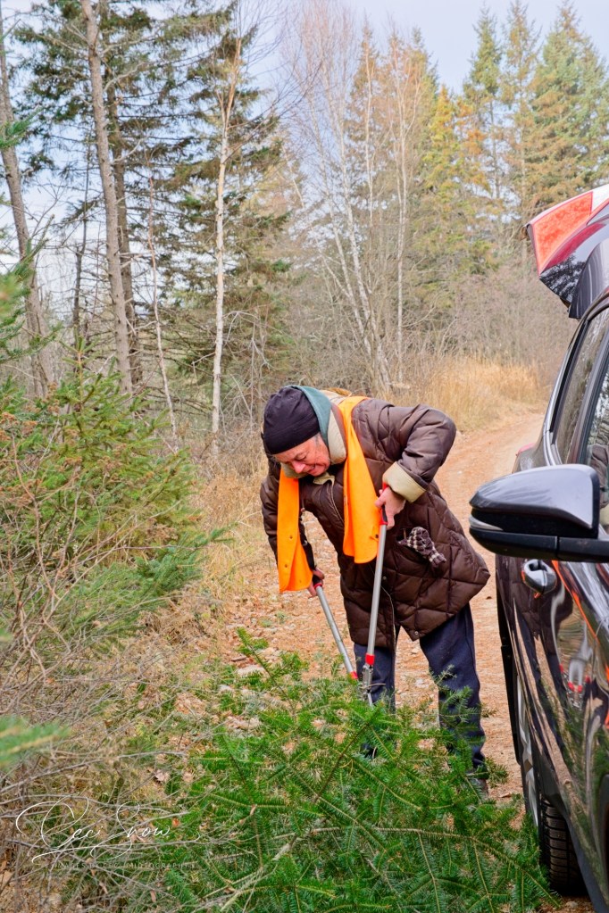 It proved to be good cover as I chatted with an elderly (well, older than us) gentleman who stopped to ask what I saw worth photographing. He went on to tell me that he had personally planted the entire stand of hardwood trees in the area behind the road in 1985. Those trees stood easily 40′ high or more – an impressive feat. He wasn’t concerned about the scrawny evergreen that we had purloined from the ditch.