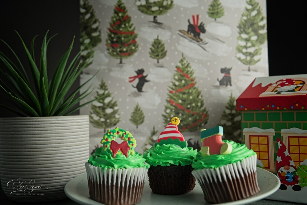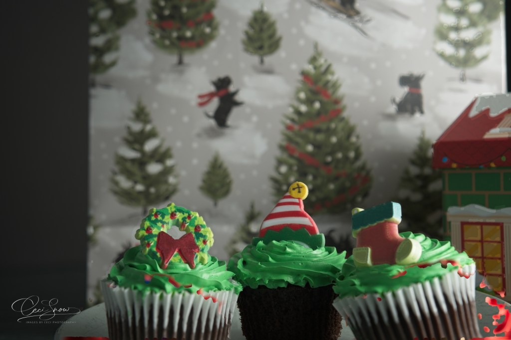 Today, the weather is rather dismal, so I spent some time setting up and using my make-shift studio in the kitchen. Armed with a simple black backdrop, a Christmas-themed piece of paper, a fake plant and some decorative cupcakes (from the Superstore bakery), I attempted to create a few seasonally appropriate scenes.